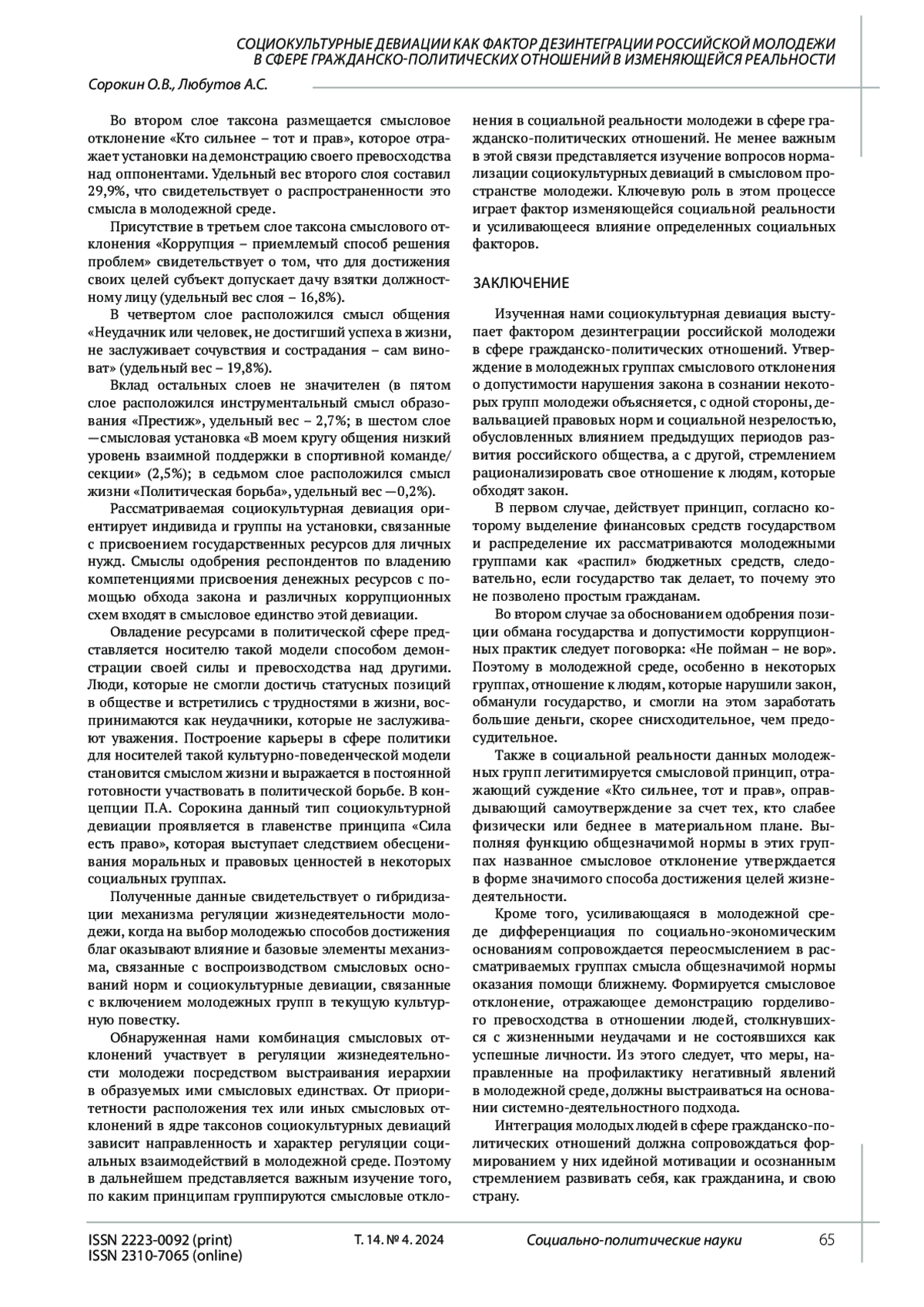 Цель исследования. В статье рассматриваются социокультурные девиации как фактор дезинтеграции российской молодежи в сфере гражданско-политических отношений. Отмечается, что в условиях переходного общества дисфункциональность социальных институтов сопровождается складывающимися социальными ограничениями для самореализации молодежи. Вследствие этого в молодежной среде усиливаются процессы переосмысления отношения к сфере гражданско-политических отношений. Социокультурные девиации в изменяющейся реальности представлены в форме смысловых отклонений, которые отражают отношение субъекта к сфере гражданско-политических отношений, построенное на принципах дезинтеграции. Выводы. В ходе проведенного социологического исследования и структурно-таксономического моделирования в социокультурном пространстве молодежи обнаружена девиация, которая объединяет узкопрагматичные и циничные принципы взаимодействия молодых людей с государством и с окружающими людьми. В ядре этой социокультурной девиации располагаются смыслы, допускающие практики нарушения закона и рассмотрения государства исключительно как «кормушки». На периферийных слоях девиации расположились смыслы, допускающие применения физической силы по отношению к оппонентам, использования коррупционных схем во взаимодействии с государством и оправдывающие горделивое превосходство над людьми, не добившихся успехов в жизни. Авторы делают выводы о необходимости применения системно-деятельностного подхода в процессе регулирования жизнедеятельности молодежи в сфере гражданско-политических отношений.