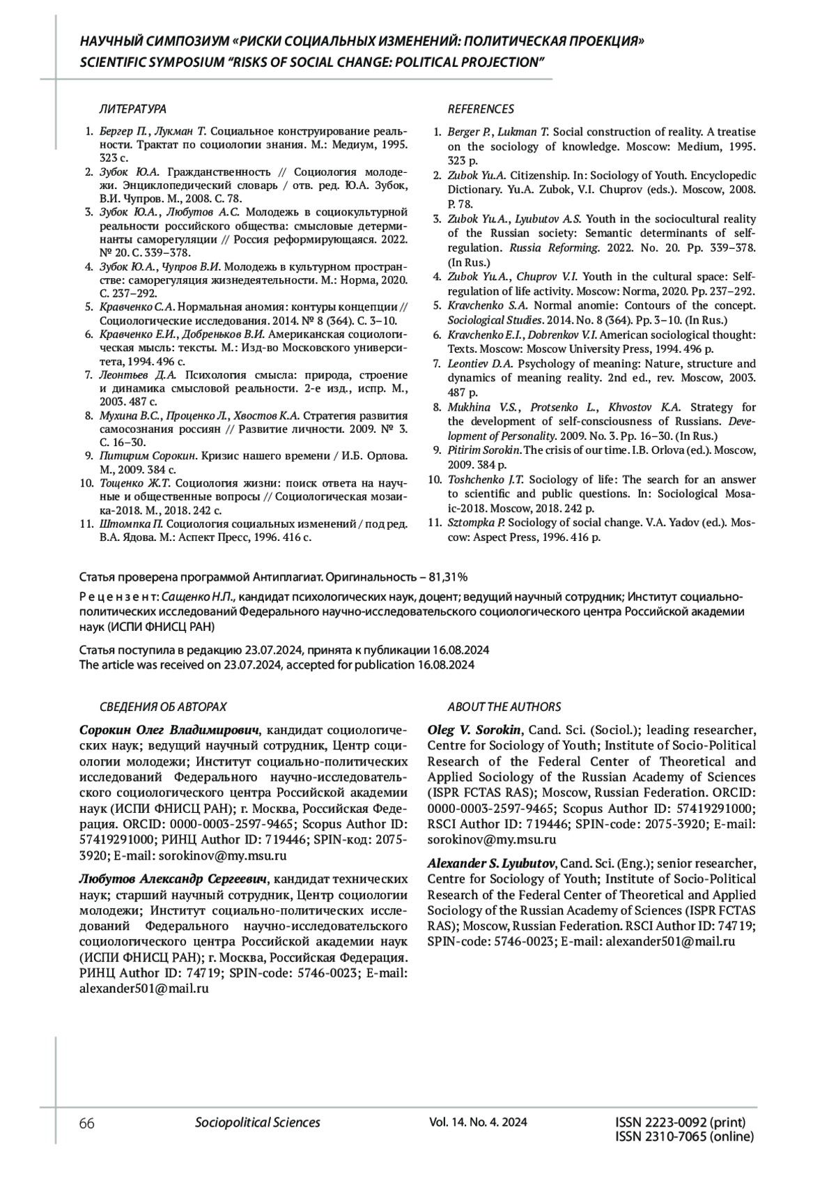 Zubok Yu.A., Lyubutov A.S. Youth in the sociocultural reality of the Russian society: Semantic determinants of self-regulation. Russia Reforming. 2022. No. 20. Pp. 339-378. (In Rus.). EDN: JEIBXB