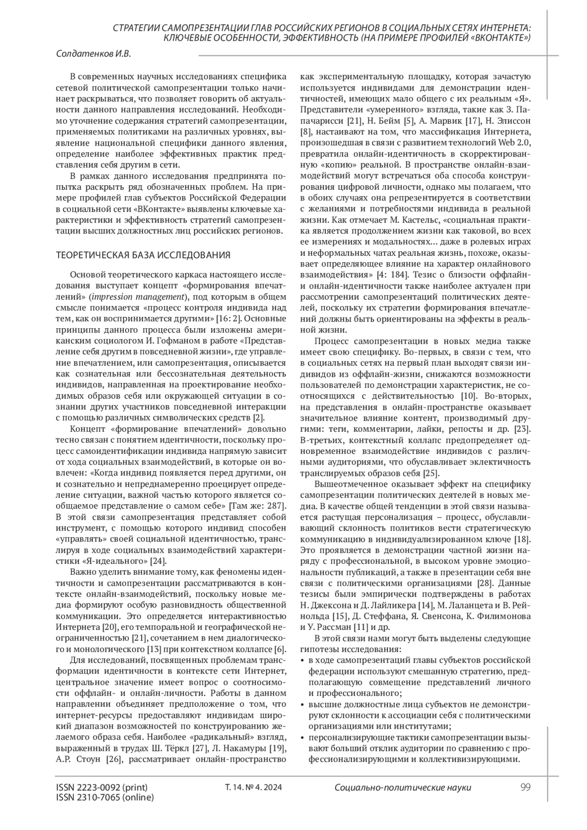 Социальные ресурсы эпохи Web 2.0 предоставляют политическим акторам широкие возможности для оказания воздействия на общественное мнение. Вместе с этим новые медиа предъявляют требования, без соответствия которым медиастратегии не могут быть успешны. В связи с этим политические деятели вынуждены адаптировать новые способы представления себя другим в ходе Интернет-коммуникации. Цель исследования - выявить особенности стратегий самопрезентации, используемых главами субъектов Российской Федерации в социальных медиа. Метод исследования - дедуктивный контент-анализ публикаций (N = 400) на стенах персональных профилей С. С. Собянина, Р. А. Кадырова, А. С. Никитина, А. Л. Текслера, О. А. Николаева, И. И. Кобзева, А. С. Цыденова, М. В. Развожаева в сети «ВКонтакте». Установлено, что политики используют сбалансированный способ представления себя, сочетающий тактики профессионализации, ассоциации с жителями региона, демонстрации взаимодействия с органами власти, освещения частной жизни. В ходе самопрезентаций внимание акцентируется на положительных эффектах профессиональной активности, на позитивной интеракции с гражданами. Выявлены значимые различия между тактиками по показателям лайков/комментариев/репостов.