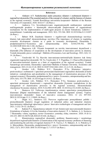 5. Веселовский М. Я. Развитие инновационно-территориальных кластеров как формы организации региональной экономики / М. Я. Веселовский, Т. В. Погодина, И. И. Чуева // Вестник Самарского университета. Экономика и управление. 2021;12 (4):15-26. DOI: 10.18287/2542-0461-2021-12-4-15-26 EDN: CWXLBX