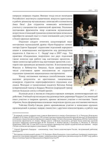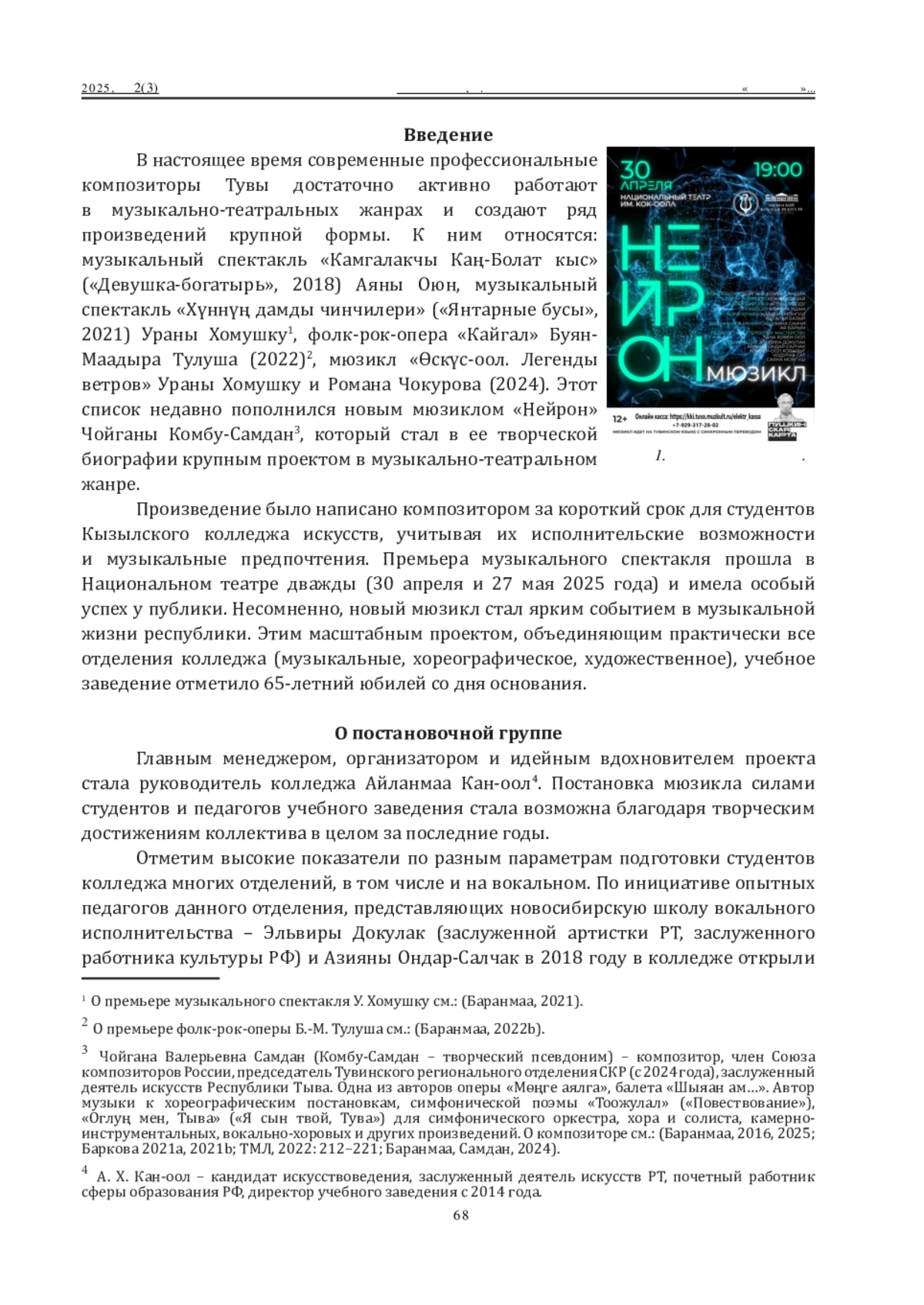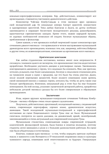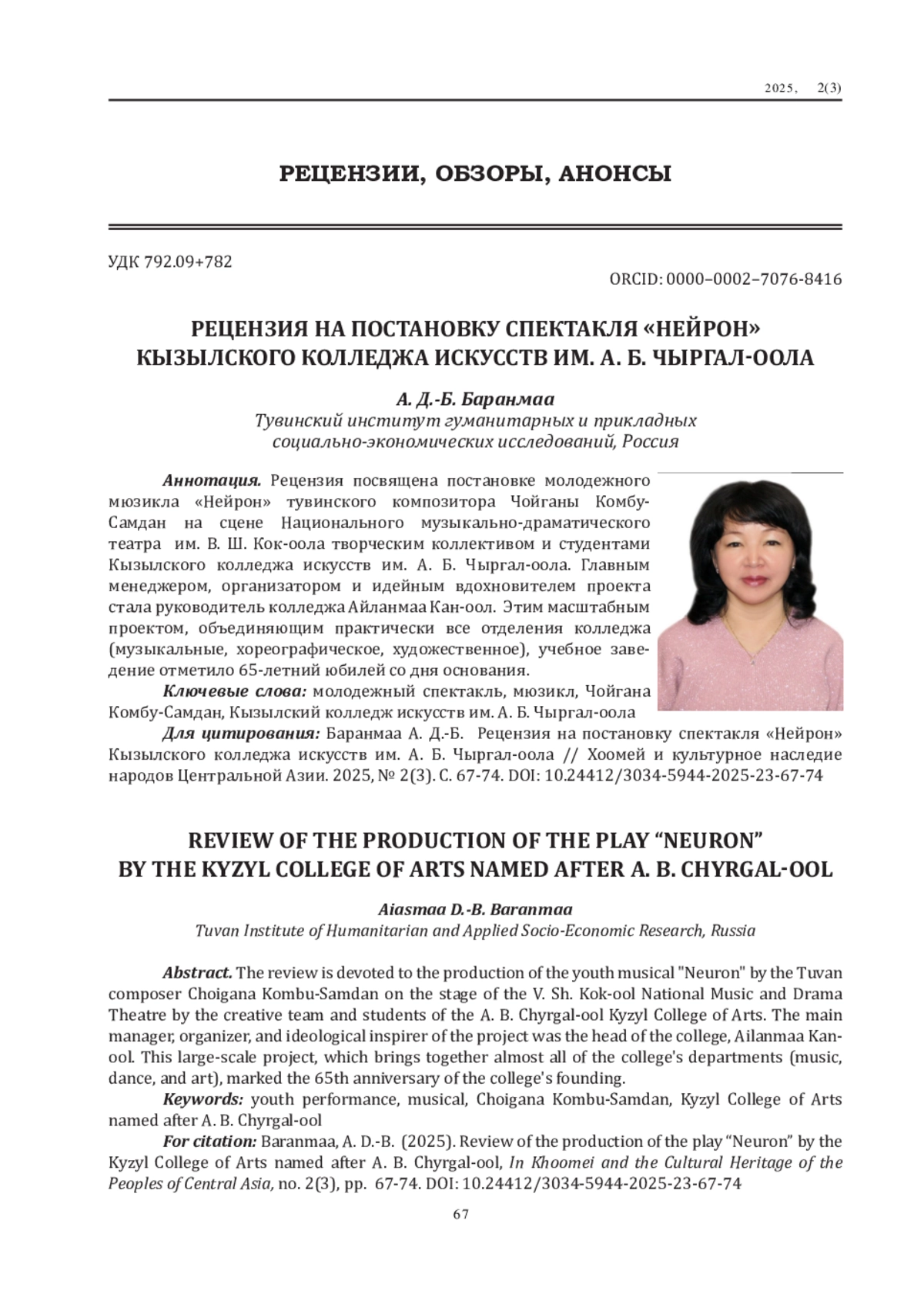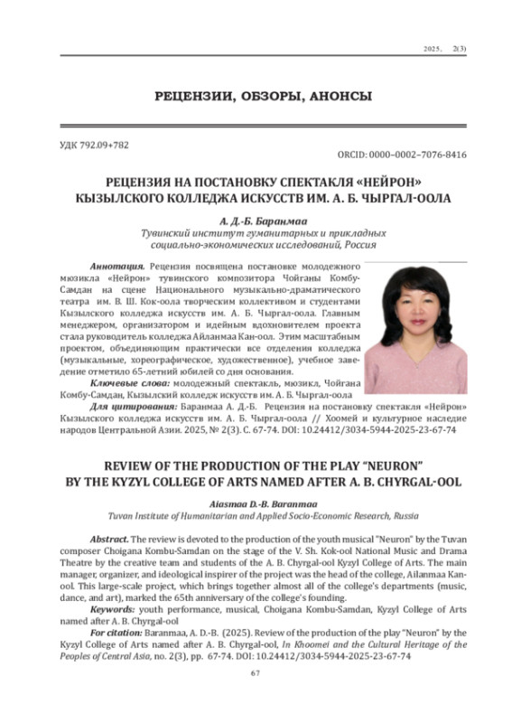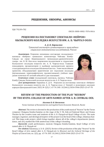 БАРАНМАА А. Д. РЕЦЕНЗИЯ НА ПОСТАНОВКУ СПЕКТАКЛЯ «НЕЙРОН» КЫЗЫЛСКОГО КОЛЛЕДЖА ИСКУССТВ ИМ. А. Б. ЧЫРГАЛ-ООЛА // ХООМЕЙ И КУЛЬТУРНОЕ НАСЛЕДИЕ НАРОДОВ ЦЕНТРАЛЬНОЙ АЗИИ. 2025. № 2