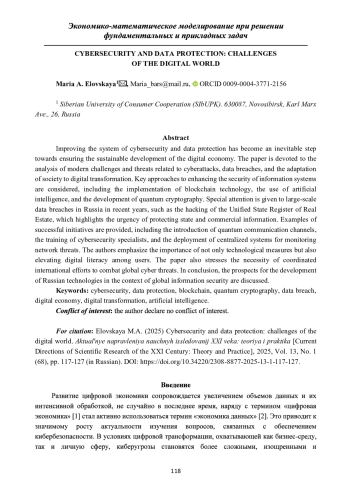 Улучшение системы кибербезопасности и защиты данных становится неизбежным шагом для обеспечения устойчивого развития цифровой экономики. Работа посвящена анализу современных вызовов и угроз, связанных с кибератаками, утечками данных и адаптацией общества к цифровой трансформации. Рассмотрены ключевые направления повышения безопасности информационных систем, включая внедрение блокчейна, использование технологий искусственного интеллекта и развитие квантовой криптографии. Особое внимание автором в статье уделено масштабным утечкам данных в России за последние годы, включая взлом Единого государственного реестра недвижимости, что подчеркивает остроту проблемы защиты государственной и коммерческой информации. Приводятся примеры успешных инициатив, таких как внедрение квантовых каналов связи, обучение специалистов в области кибербезопасности и применение централизованных систем мониторинга сетевых угроз. Автор подчеркивают важность не только технологического обеспечения, но и повышения цифровой грамотности пользователей. Также в статье сделан акцент на необходимости согласованных международных усилий в борьбе с глобальными киберугрозами. В заключении обсуждаются перспективы развития российских технологий в контексте глобальной информационной безопасности.