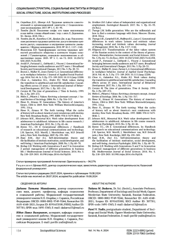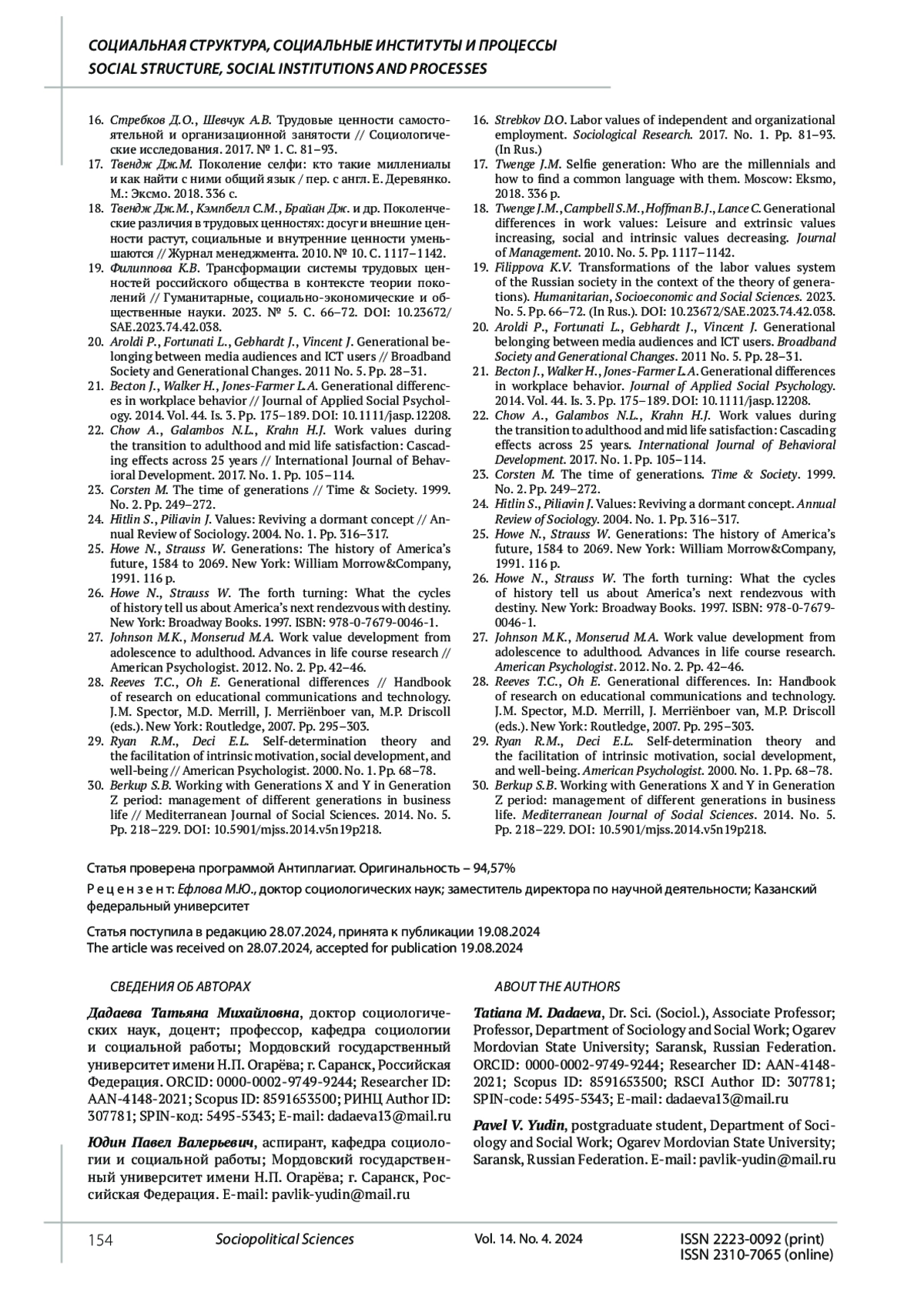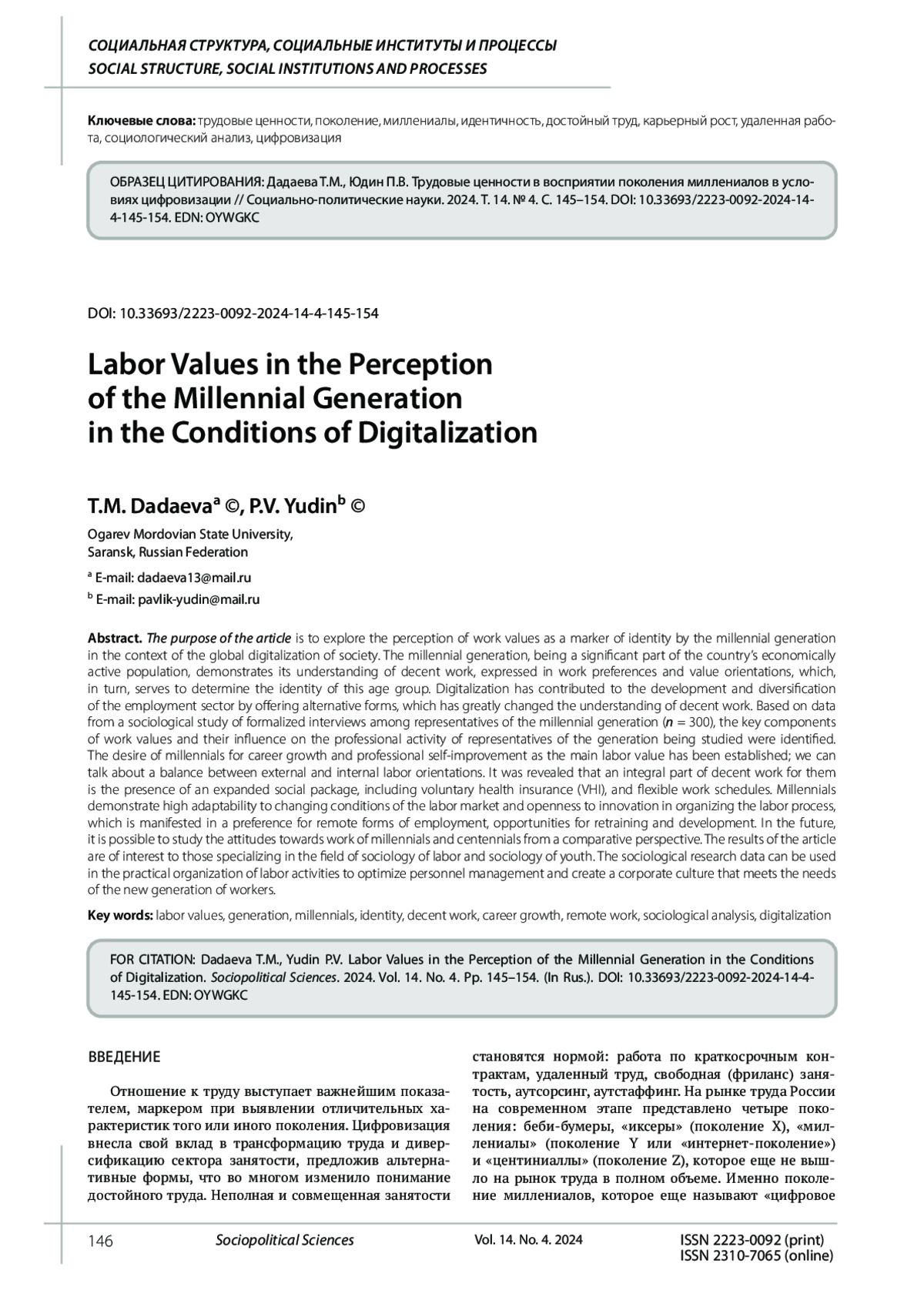 Цель статьи - исследовать восприятие трудовых ценностей как маркера идентичности поколением миллениалов в контексте глобальной цифровизации общества. Поколение миллениалов, выступая значительной частью экономически активного населения страны, демонстрирует свое понимание достойного труда, выражающееся в трудовых предпочтениях и ценностных ориентаций, что, в свою очередь, служит для определения идентичности данной возрастной группы. Цифровизация внесла свой вклад в развитие и диверсификацию сектора занятости, предложив альтернативные формы, что во многом изменило понимание достойного труда. На основе данных социологического исследования, формализованных интервью среди представителей поколения миллениалов (n = 300) выявлены ключевые составляющие трудовых ценностей и их влияние на профессиональную активность представителей изучаемого поколения. Установлено, что для миллениалов наибольшую ценность при выборе места работы имеет возможность карьерного роста и признание профессиональных качеств, а также хороший микроклимат в коллективе, на третьей позиции - уровень заработной платы. Выявлено, что в качестве трудовых преимуществ у миллениалов выступают возможность удаленной работы, предоставление полиса добровольного медицинского страхования (ДМС) и бесплатного питания. Игреки демонстрируют высокую адаптивность к меняющимся условиям трудового рынка и открытость к инновациям в организации трудового процесса, что проявилось в предпочтении удаленных форм занятости, возможности для переобучения и развития. Следовательно, можно говорить о балансе между внешними и внутренними трудовыми ориентациями для данного поколения. В перспективе можно исследовать в сравнительном аспекте отношение к труду миллениалов и центиниаллов. Результаты статьи представляют интерес для специализирующихся в области социологии труда и социологии молодежи. Данные социологического исследования могут быть использованы в практической организации трудовой деятельности по оптимизации управления персоналом и формирования корпоративной культуры, отвечающей запросам нового поколения работников.