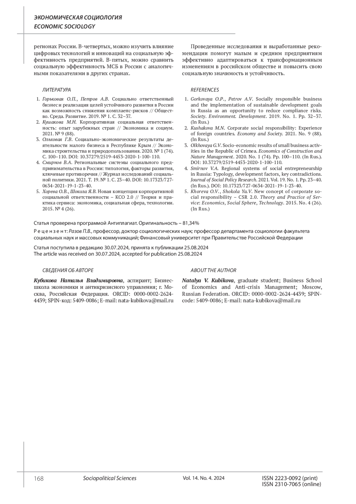 4. Смирнов В.А. Региональные системы социального предпринимательства в России: типология, факторы развития, ключевые противоречия // Журнал исследований социальной политики. 2021. Т. 19. № 1. С. 23-40. DOI: 10.17323/727-0634-2021-19-1-23-40 EDN: PRGWSK