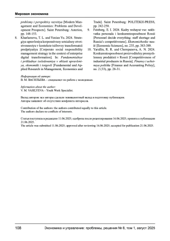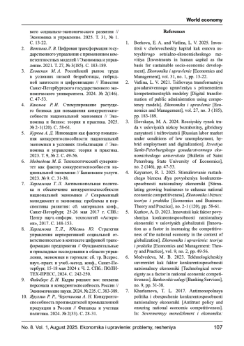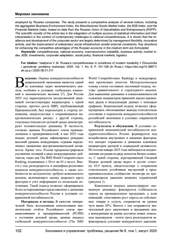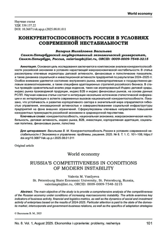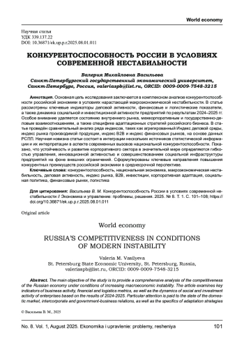 ВАСИЛЬЕВА В. М. КОНКУРЕНТОСПОСОБНОСТЬ РОССИИ В УСЛОВИЯХ СОВРЕМЕННОЙ НЕСТАБИЛЬНОСТИ // ЭКОНОМИКА И УПРАВЛЕНИЕ: ПРОБЛЕМЫ, РЕШЕНИЯ. 2025. ТОМ 1 № 8