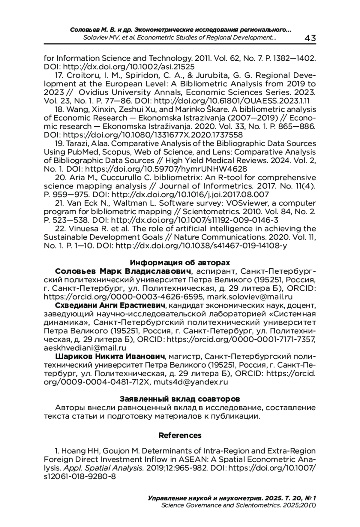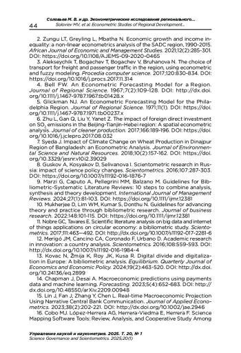 Заключение. Проведенный в рамках исследования библиометрический анализ позволил выявить ключевые направления научных работ в области эконометрического моделирования регионального развития. Разработанный авторами алгоритм и методология системного анализа библиографии дали возможность определить наиболее значимые и весомые научные труды в рассматриваемой области. Представленные разнообразные визуализации данных проиллюстрировали междисциплинарный характер рассмотренных исследований. Дальнейшие исследования в освещаемой области возможны в части поиска и внедрения новых перспективных методов библиометрического анализа данных.