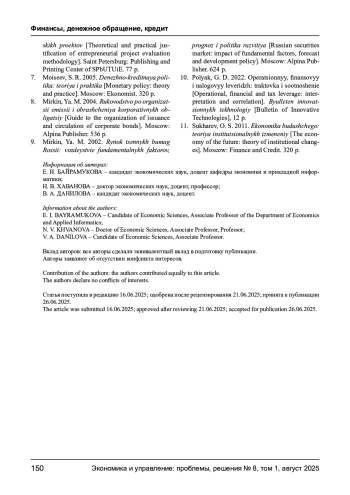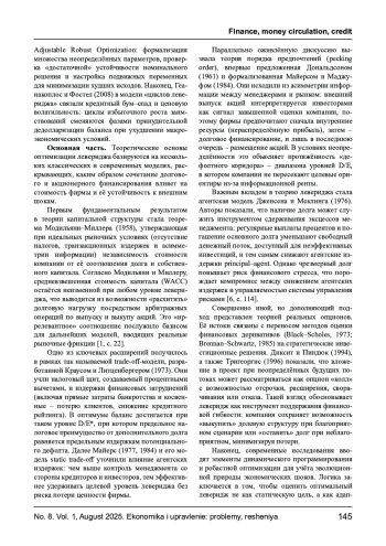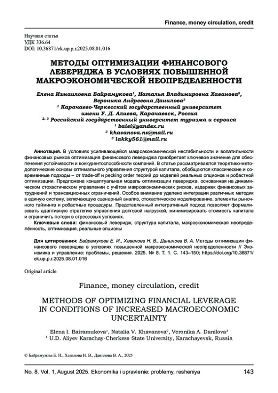 БАЙРАМУКОВА Е. И., ХАВАНОВА Н. В., ДАНИЛОВА В. А. МЕТОДЫ ОПТИМИЗАЦИИ ФИНАНСОВОГО ЛЕВЕРИДЖА В УСЛОВИЯХ ПОВЫШЕННОЙ МАКРОЭКОНОМИЧЕСКОЙ НЕОПРЕДЕЛЕННОСТИ // ЭКОНОМИКА И УПРАВЛЕНИЕ: ПРОБЛЕМЫ, РЕШЕНИЯ. 2025. ТОМ 1 № 8