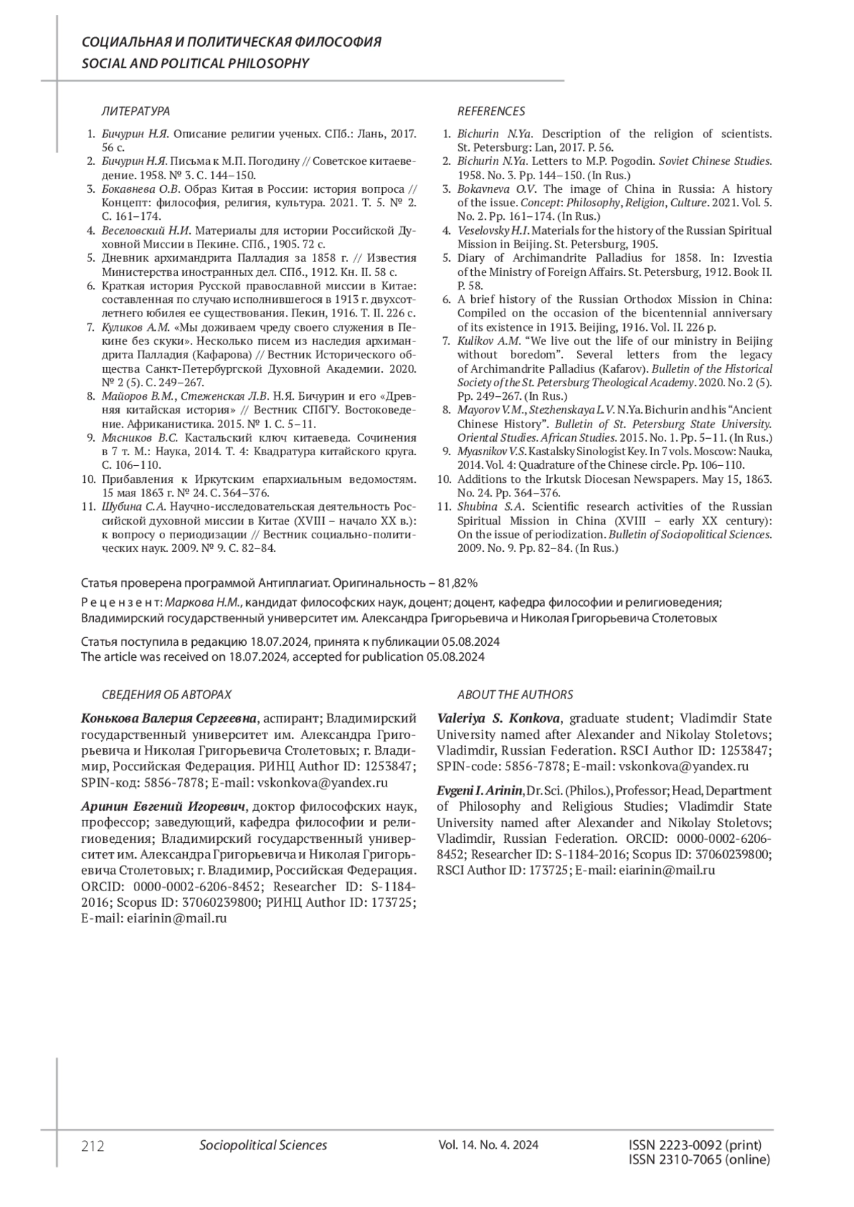 Shubina S.A. Scientific research activities of the Russian Spiritual Mission in China (XVIII - early XX century): On the issue of periodization. Bulletin of Sociopolitical Sciences. 2009. No. 9. Pp. 82-84. (In Rus.).