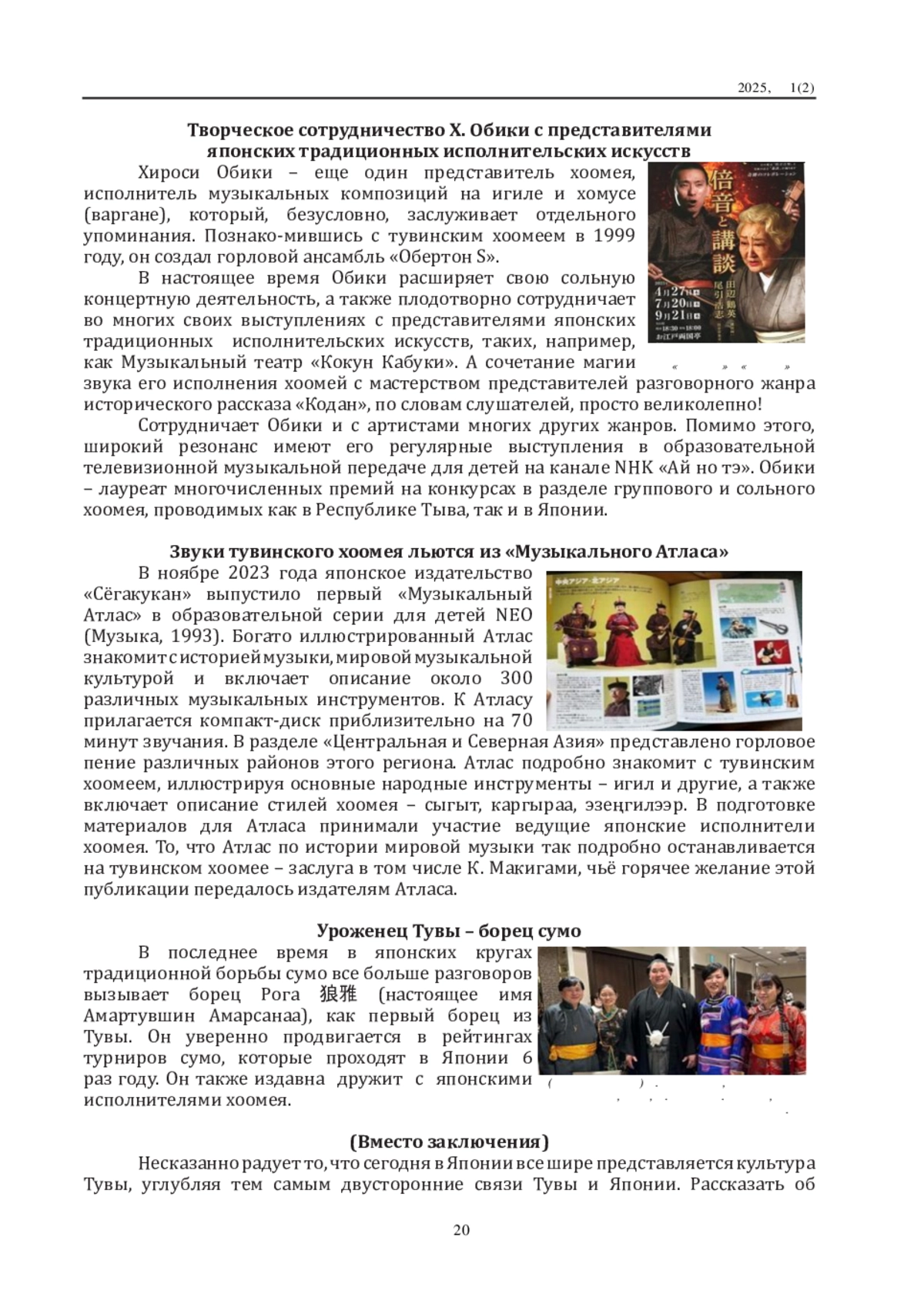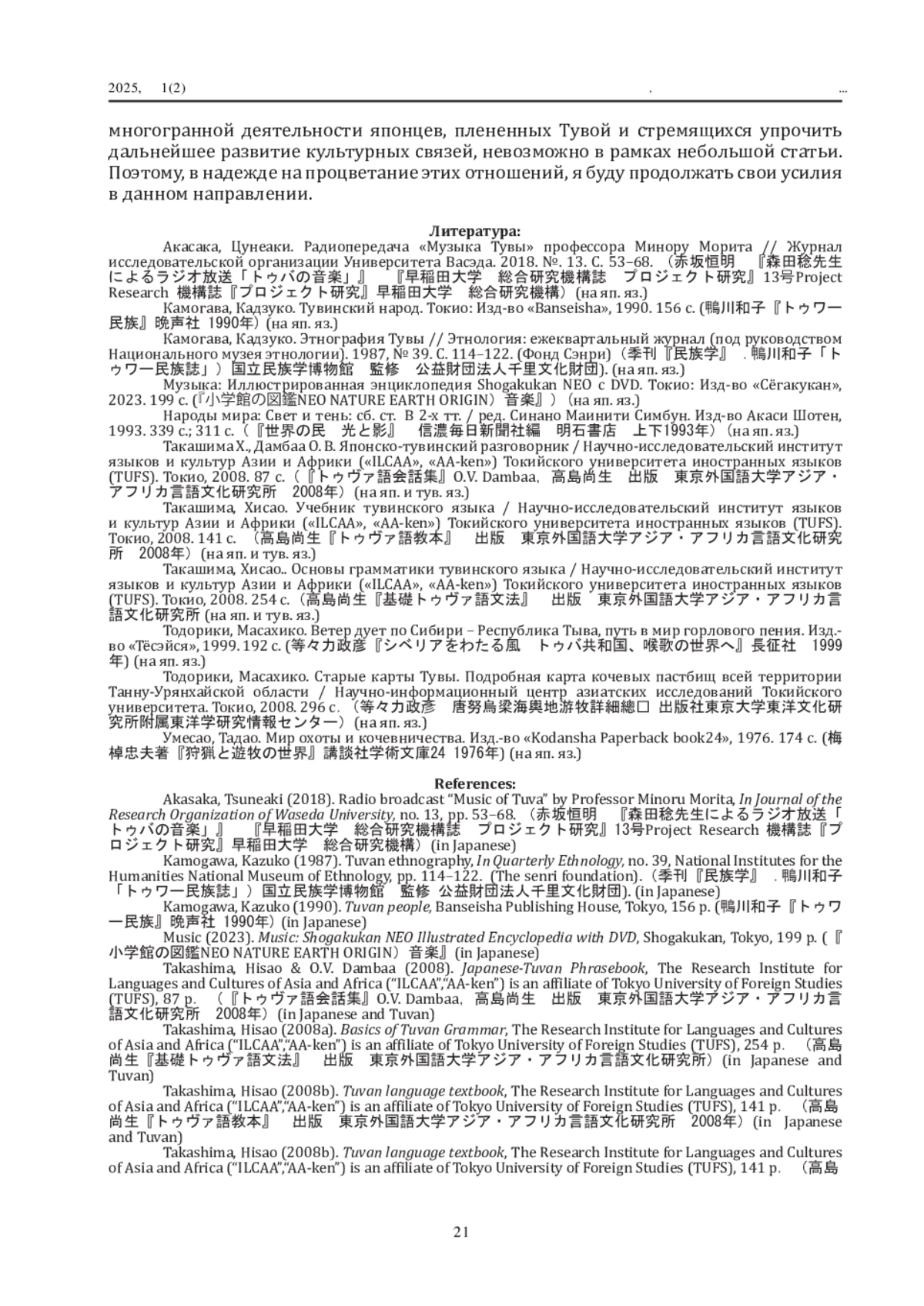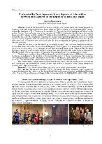КАМОГАВА К. ПЛЕНЕННЫЕ ТУВОЙ ЯПОНЦЫ: НЕКОТОРЫЕ АСПЕКТЫ ВЗАИМОДЕЙСТВИЯ КУЛЬТУР РЕСПУБЛИКИ ТЫВА И ЯПОНИИ // ХООМЕЙ И КУЛЬТУРНОЕ НАСЛЕДИЕ НАРОДОВ ЦЕНТРАЛЬНОЙ АЗИИ. 2025. № 1