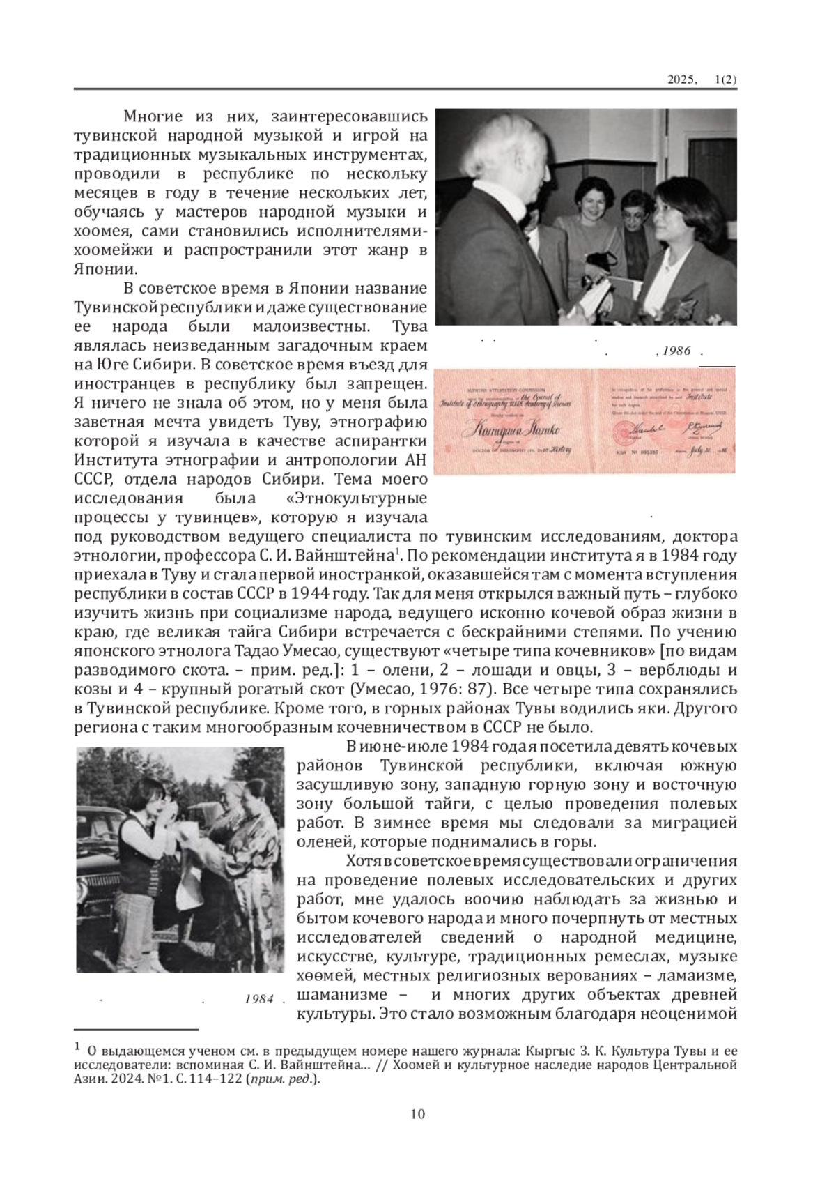 Во времена существования Советского Союза о Тувинской республике в Японии практически ничего не было известно. В то время с целью написания диссертации «Этнокультурные процессы у тувинцев» под руководством специалиста по Туве Советской Академии наук С. И. Вайнштейна летом 1984 года автор впервые ступила на тувинскую землю, явившись первой иностранкой, приехавшей в Туву, начиная с 1944 года. Позднее в том же в 1984 году, а также в 1990 году автор посетила Туву с целью проведения полевых работ для сбора материалов. На основе проведенных исследований автор подготовила монографию, ряд научных и публицистических статьей, докладов и открытых лекций. Они знакомят с тем, как тувинские специалисты и исследователи закладывали фундамент последующего процветания японо-тувинских культурных взаимоотношений.