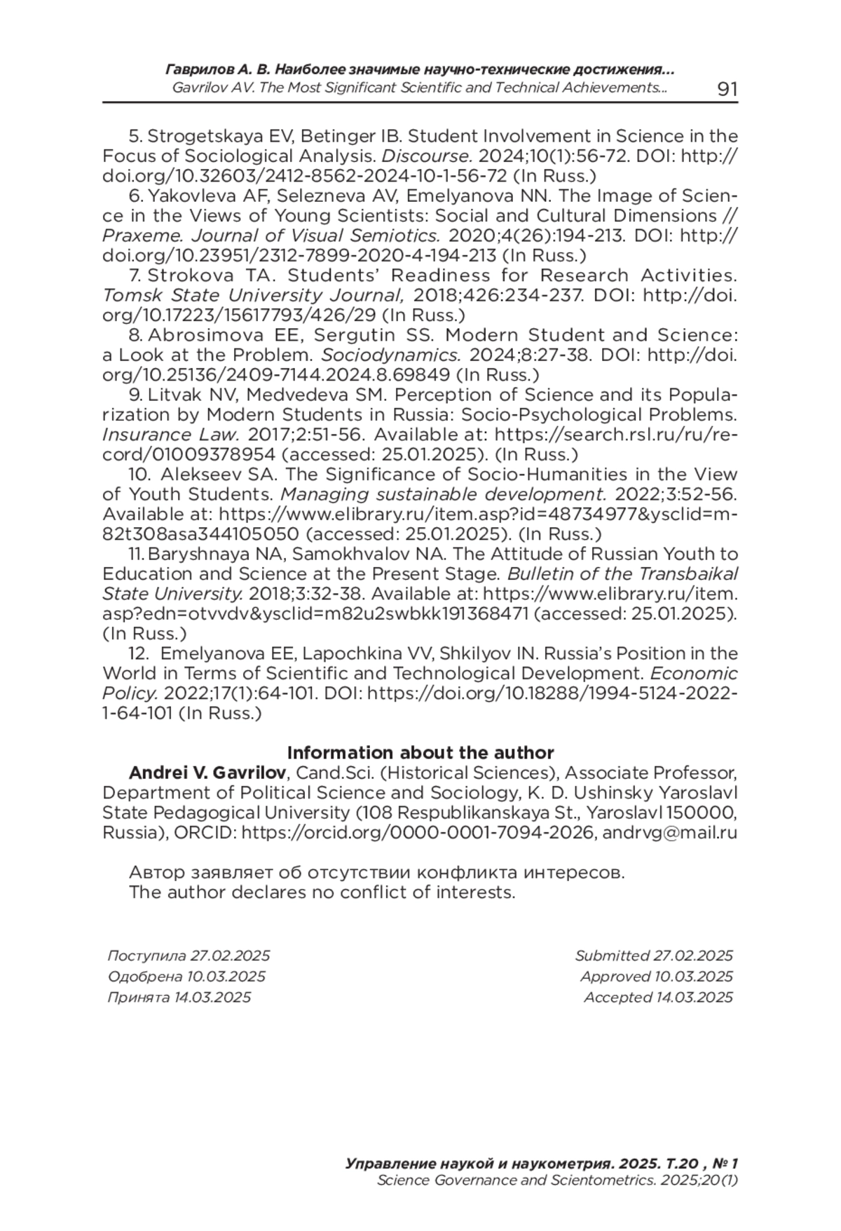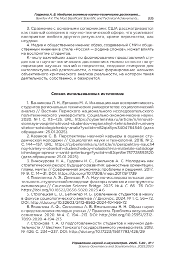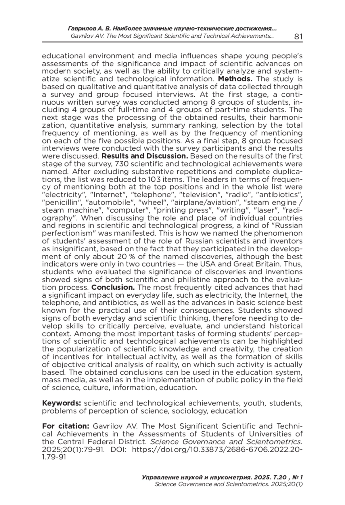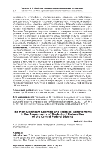 Введение. Настоящая статья посвящена исследованию восприятия наиболее значимых научно-технических достижений молодежной студенческой аудиторией. Основное внимание уделяется тому, как различные факторы, такие как социальный контекст, образовательная среда и медийные воздействия, формируют у молодежи оценку значимости научных достижений и их влияния на современное общество, а также способность к критическому анализу и систематизации научно-технической информации.