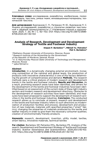 Результаты и дискуссия. Выявлены перспективные направления исследований, определены драйверы развития текстильной и обувной промышленности на основе оценки текущего состояния данных отраслей легкой промышленности и современных направлений исследований и разработок. Определены препятствия для развития исследовательской деятельности, предложены направления развития исследовательской деятельности в текстильной и обувной промышленности.