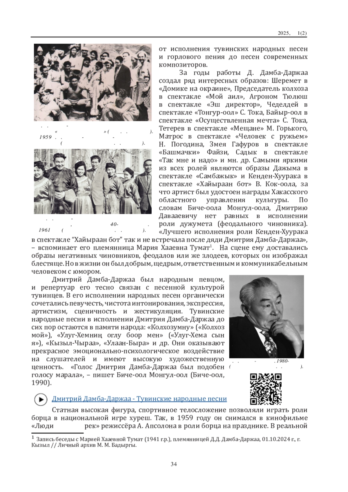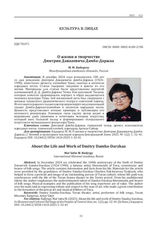 БАДЫРГЫ М. М. О ЖИЗНИ И ТВОРЧЕСТВЕ ДМИТРИЯ ДАВААЕВИЧА ДАМБА-ДАРЖАА // ХООМЕЙ И КУЛЬТУРНОЕ НАСЛЕДИЕ НАРОДОВ ЦЕНТРАЛЬНОЙ АЗИИ. 2025. № 1