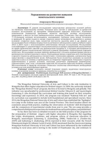 МУНХЖАРГАЛ А. УПРАЖНЕНИЯ НА РАЗВИТИЕ НАВЫКОВ МОНГОЛЬСКОГО ХOOМИЯ // ХООМЕЙ И КУЛЬТУРНОЕ НАСЛЕДИЕ НАРОДОВ ЦЕНТРАЛЬНОЙ АЗИИ. 2025. № 1