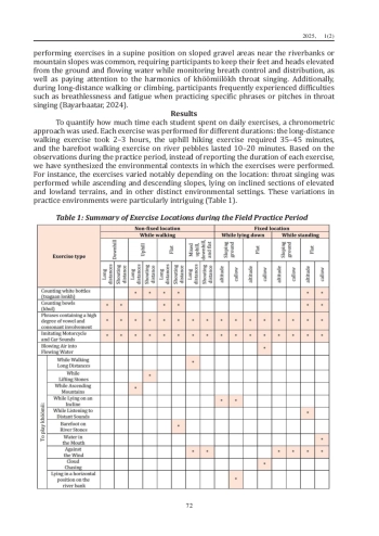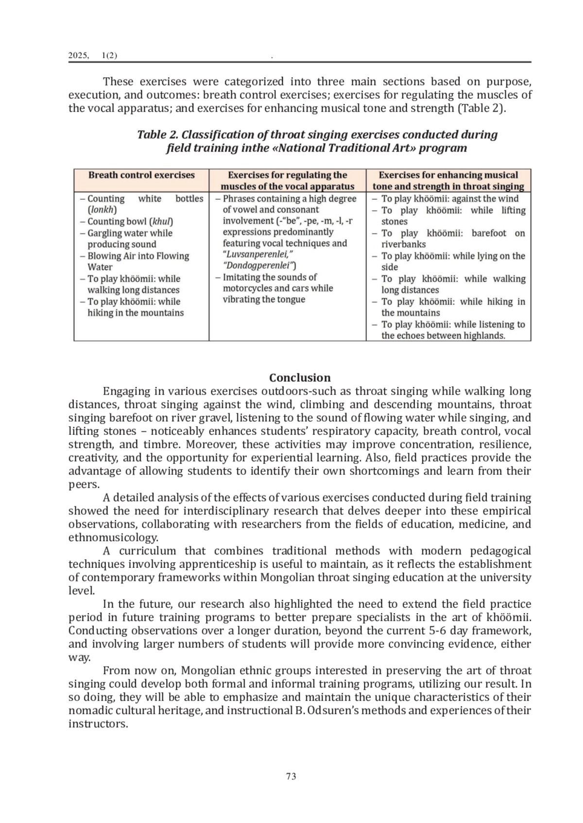 This study reports the results of field study and experiments that are part of the modern training of Mongolian khöömii. The primary goal is to observe the process of field training in the “National Folk Art” program. A key component of the program is the annual field training conducted every August at the university’s “Egshiglen” eco-camp. This 7–10-day field exercise emphasizes the profound relationship between humans and nature. During the camp, students practice in diverse settings, such as open fields, mountains, rocky areas, water bodies, and rivers. Data for this research were collected through direct observation of the 2023 and 2024 field training sessions, employing qualitative research methods. The study categorizes and documents the sequence and process of exercises carried out under the guidance of Baataryn Odsuren, during the field training sessions, providing a detailed analysis of the pedagogical approaches within the “National Folk Art” program. Field practice observation research was conducted with the approval of the school administration and the head of the relevant department. The daily lives and practices of all participating students were observed under ethical standards, and the findings were reported for academic purposes. Our observations were entirely based on the field practice of the khöömii class and were conducted in open natural areas. Each day, the students practiced in various environments (uphill, inclined, eccentric, windy, mountainous, watery, rocky) using different exercises (upright, horizontal, sitting, standing, with weight lifting, without lifting, barefoot, with shoes). The location and nature of the “Egshiglen” eco-camp fully provided the necessary conditions for these diverse practices. The study categorizes and documents the sequence and process of exercises carried out under the guidance of Baataryn Odsuren during the field training sessions, providing a detailed analysis of the pedagogical approaches within the “National Folk Art” program.
