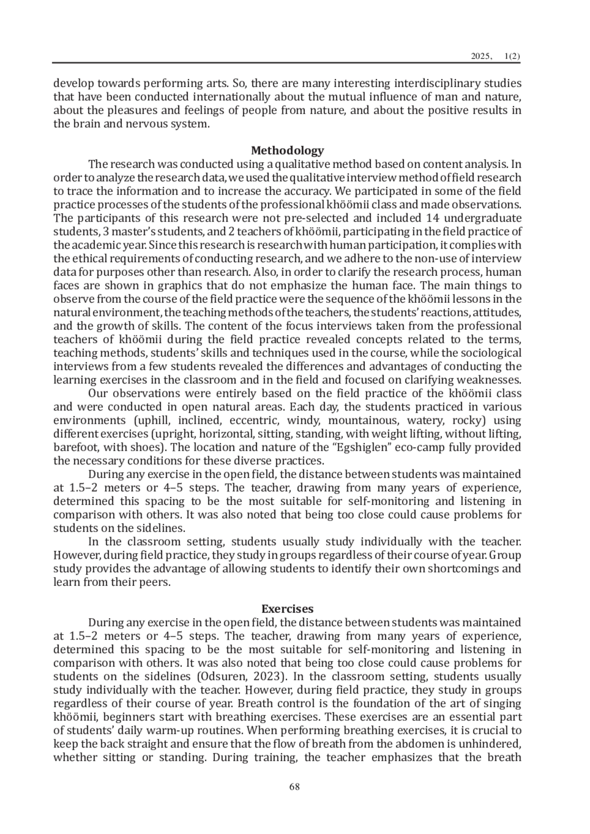 В данном исследовании представлены результаты полевой работы по обучению монгольскому хooмию. Основная цель состоит в наблюдении за процессом полевого исследования по программе «Национальное народное искусство». Ключевым компонентом упомянутой программы является ежегодное полевое исследование, проводимое в августе на базе университетского эколагеря «Эгшиглен». Оно представлено 7–10-дневным полевым исследованием, подчеркивает глубокую связь между человеком и природой. Во время отдыха в лагере студенты имеют возможность заниматься в разных условиях: открытые поля, горы, скалистые местности, водоемы, реки и др. Данные для исследования были собраны посредством включенного наблюдения в период учебного курса 2023 и 2024 годов с использованием качественных методов исследования. Исследование классифицирует и документирует последовательность и процесс упражнений, выполняемых во время практических занятий под руководством Одсурена Б., в которых рассматривается подробный анализ педагогических подходов в рамках программы «Национальное народное искусство». Исследование полевых практик проводилось с согласия администрации школы и руководителя соответствующего отдела. Повседневная жизнь и практика всех участвующих в проекте студентов наблюдались в соответствии с этическими нормами, а результаты были представлены в академических целях. Наблюдения были полностью основаны на полевой практике класса по хooмию, и проводились на открытых территориях. Ежедневно студенты практиковались в разных условиях, выполняя различные упражнения (вертикально, горизонтально, сидя, стоя, с поднятием тяжестей, без поднятия тяжестей, босиком, в обуви). Местоположение и характер эколагеря «Эгшиглен» полностью обеспечивали необходимые условия для этих разнообразных практик.