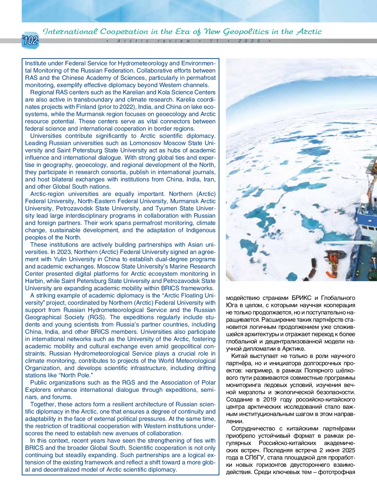 Однако, экономических намерений недостаточно: Арктика – хрупкая экосистема, требующая международной координации усилий в сфере экологии, науки и безопасности. В условиях глобальной турбулентности и санкций, которые коллективный Запад применяет против России, научная дипломатия приобретает всё большее значение. Научное сотрудничество остаётся одной из немногих относительно нейтральных площадок, где может продолжаться конструктивный диалог несмотря на политические разногласия.