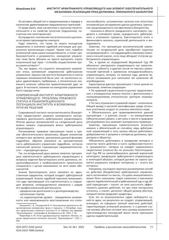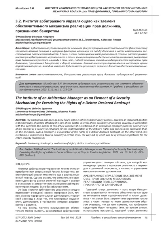 Арбитражный управляющий как ключевая фигура процесса несостоятельности (банкротства) занимает важную позицию в иерархии факторов, влияющих на судьбу должника в части возможности восстановления платежеспособности. В связи с этим потенциалом автор настоящей статьи рассматривает институт арбитражного управляющего с точки зрения концепции обеспечительного механизма реализации прав должника и приходит к выводу о том, что, с одной стороны, такой менеджер является гарантом прав должника, признанного банкротом, с другой стороны, данный институт переживает в настоящее время определенный кризис, выход из которого будет иметь решающее значение для всего обеспечительного механизма.