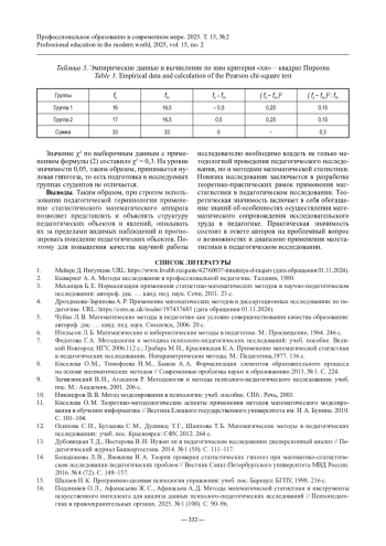 Результаты. К результатам работы можно отнести описание и анализ проблем, связанных с раскрытием понятий зависимой и независимой переменных в педагогическом исследовании, количественных и качественных методов исследования, критериев и показателей оценки результатов исследований. Раскрыто представление о том, что только рациональное применение статистики позволяет и педагогу находить зависимости между экспериментальными данными, выявлять наличие или отсутствие тенденций в экспериментальных и контрольных группах. Авторами предложены методы математической статистики, которые они применили в своих педагогических исследованиях: критерий φ* Фишера, критерий Краскела – Уоллиса, критерий «хи» – квадрат Пирсона и методика И. К. Шалаева по оценке результативности экспериментальной работы.