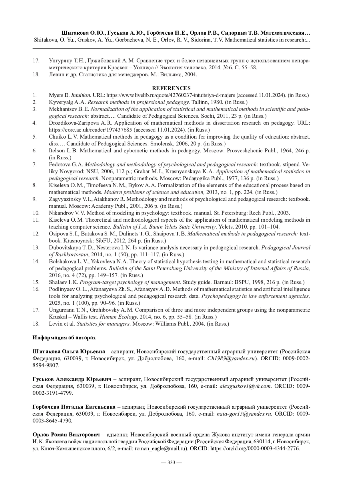 16. Подлиняев О.Л., Афанасьева Ж.С., Афанасьев А.Д. Методы математической статистики и инструменты искусственного интеллекта для анализа данных психолого-педагогических исследований // Психопедагогика в правоохранительных органах. 2025. № 1 (100). С. 90-96.