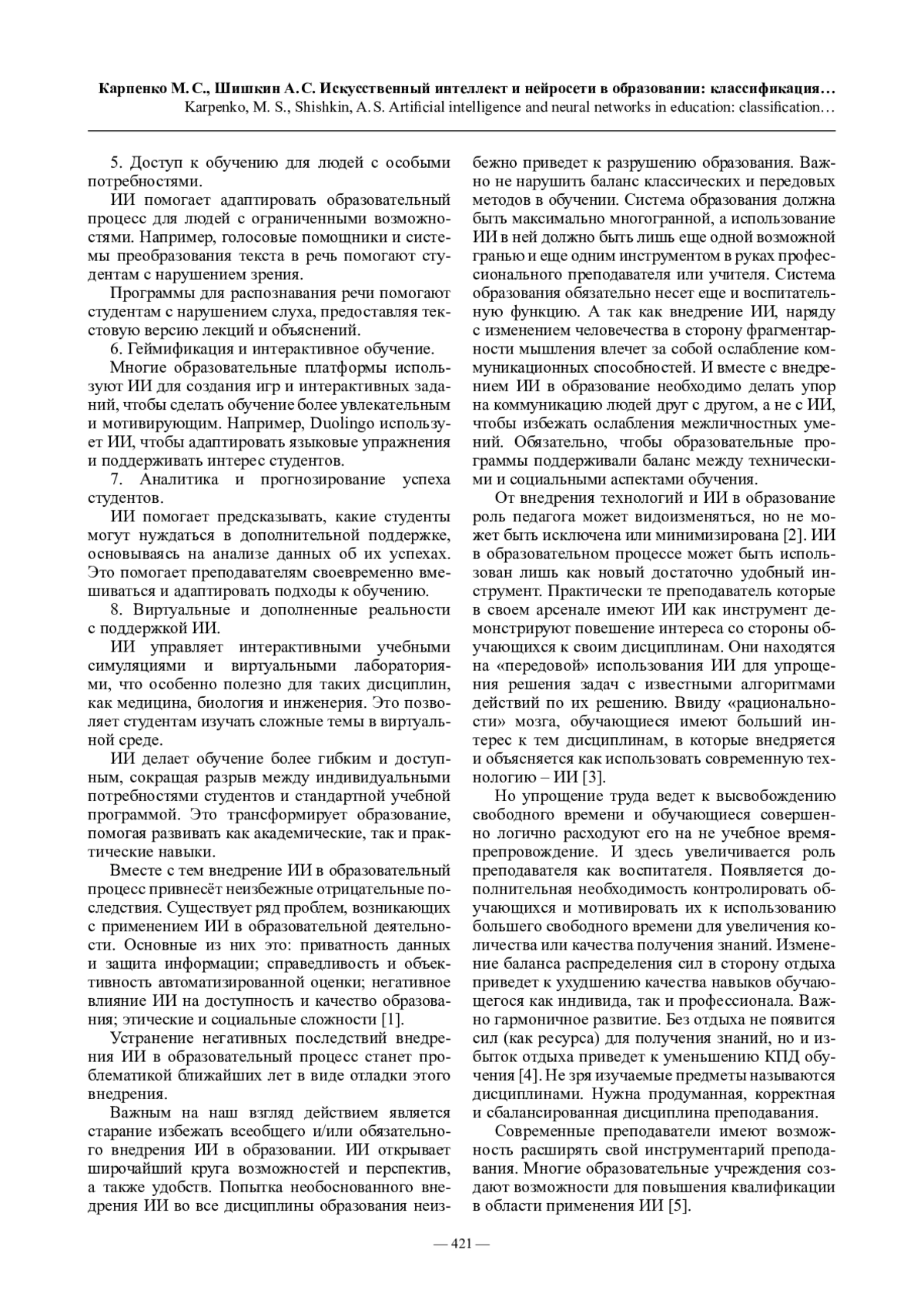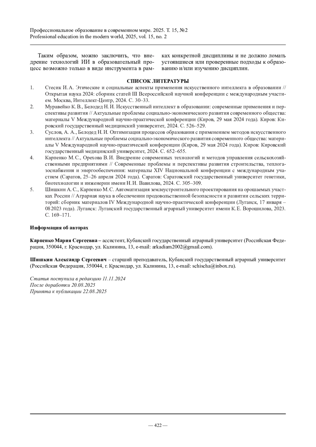 1. Стесик И.А. Этические и социальные аспекты применения искусственного интеллекта в образовании // Открытая наука 2024: сборник статей III Всероссийской научной конференции с международным участием. Москва, Интеллект-Центр, 2024. С. 30-33.