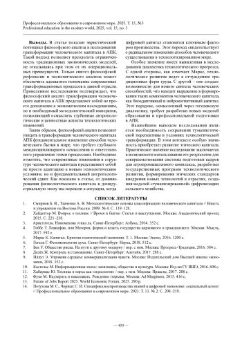Современный этап, соответствующий шестому технологическому укладу (с 2010-х гг.), характеризуется окончательным становлением экономики технологий в АПК. Искусственный интеллект, интернет вещей, технологии точного земледелия, геномное редактирование – все это превращает цифровой капитал в ключевой компонент человеческого капитала.