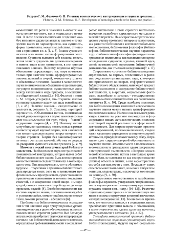 Введение. Расширение спектра методов и форм, пригодных к применению в современных библиотековедческих исследованиях, позволяет достичь сближения и взаимодействия различных концептуально-методологических подходов, а также таких результативных эффектов, которые удовлетворяют потребность в практической отдаче от теоретических построений. Современная методология науки вырабатывает все более полные системы и модели научного знания, являющиеся результатом особого методологического анализа, что, естественно, приводит к существенной трансформации взглядов на входящие в эти системы формообразования знания и познания. Научные законы являются отражением объективно существующих в каждой системе знания свойств, отношений или связей между явлениями и процессами; меняются они – трансформируются законы, либо в законы преобразуются теоретические структуры, которые раньше не существовали в этом качестве. Данный эволюционный процесс неизбежно ведет, помимо инновационных преобразований в стратегии научного познания, к изменениям в практической деятельности социальных институтов, в частности – в образовательных программах и структуре учебных дисциплин гуманитарного цикла. Постановка задачи.