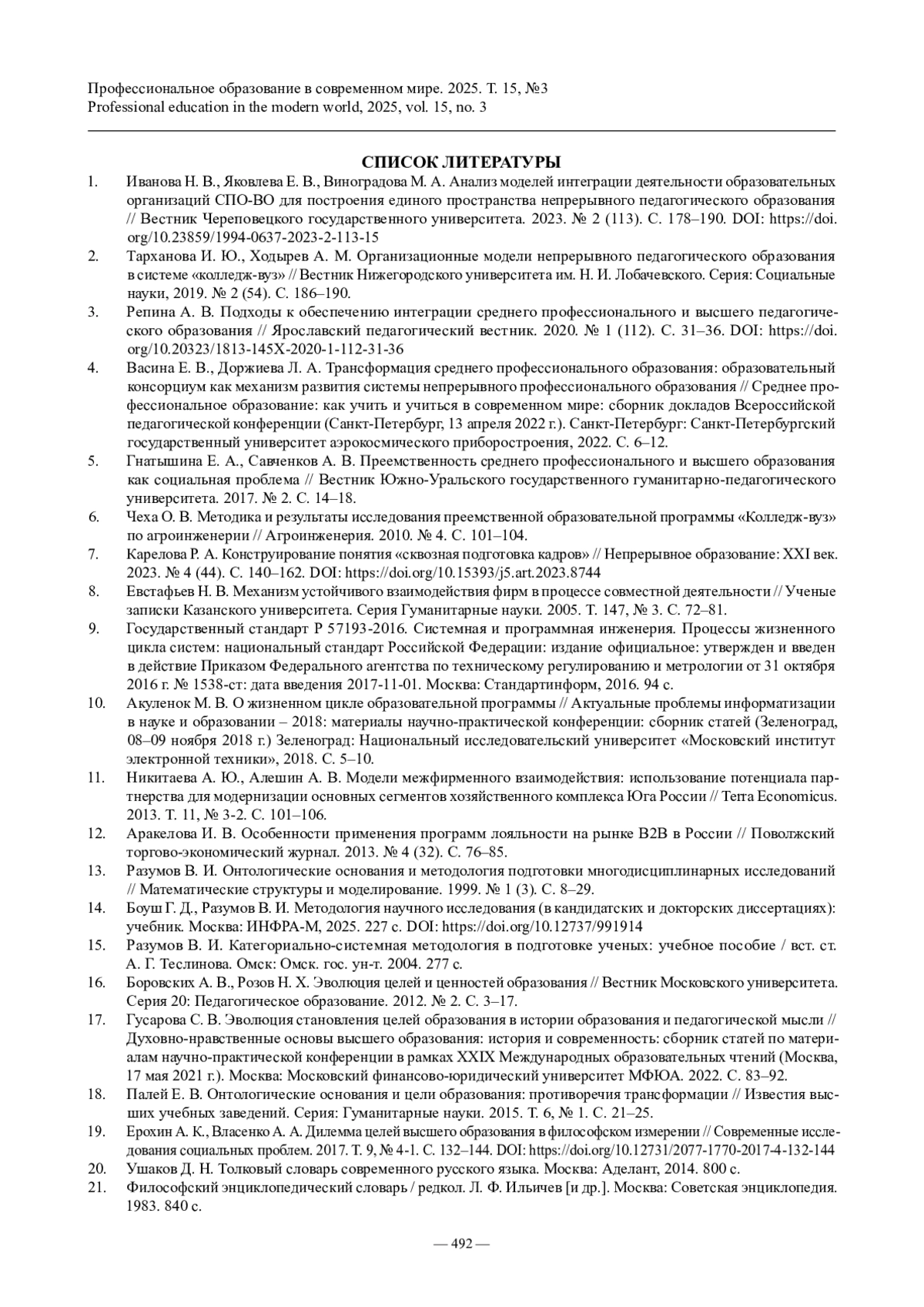 1. Иванова Н. В., Яковлева Е. В., Виноградова М. А. Анализ моделей интеграции деятельности образовательных организаций СПО-ВО для построения единого пространства непрерывного педагогического образования // Вестник Череповецкого государственного университета. 2023. № 2 (113). С. 178-190. https://doi.org/https://doi.org/10.23859/1994-0637-2023-2-113-15