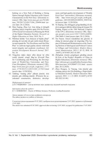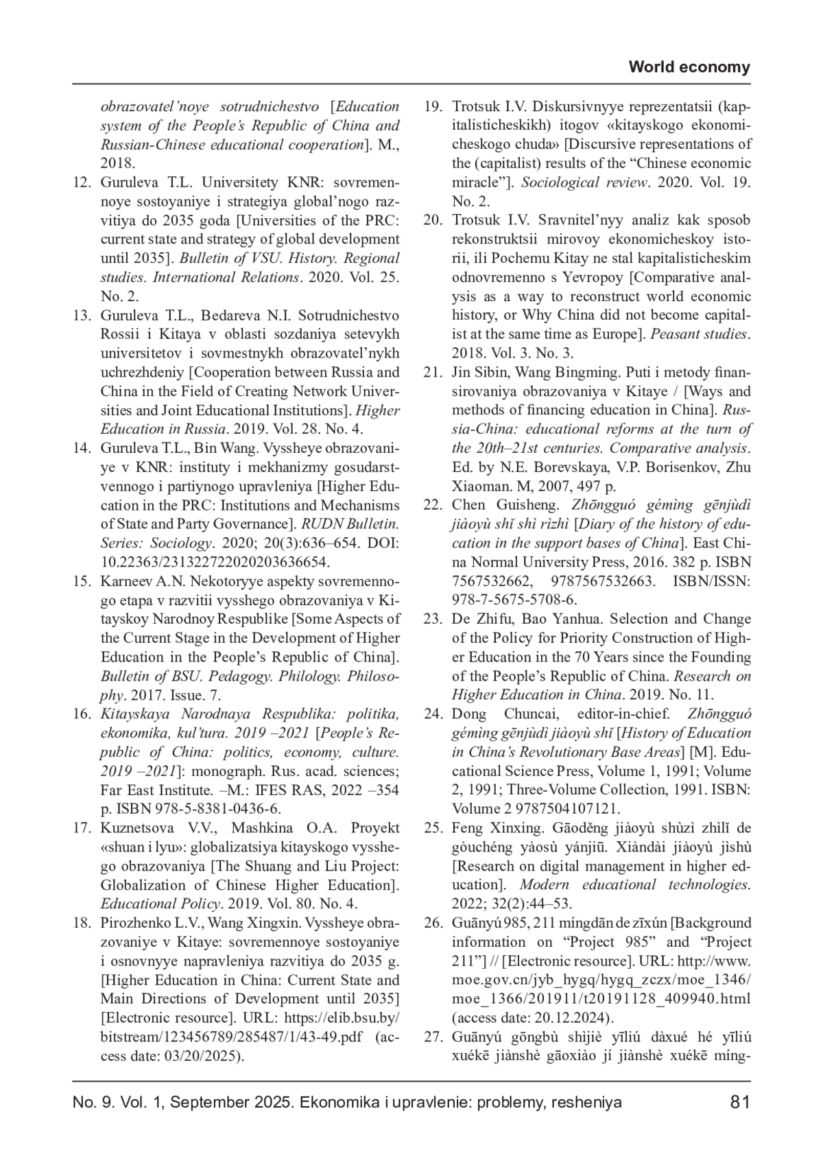 12. Гурулева Т.Л. Университеты КНР: современное состояние и стратегия глобального развития до 2035 года // Вестник ВГУ. История. Регионоведение. Международные отношения. 2020. Т. 25. № 2.