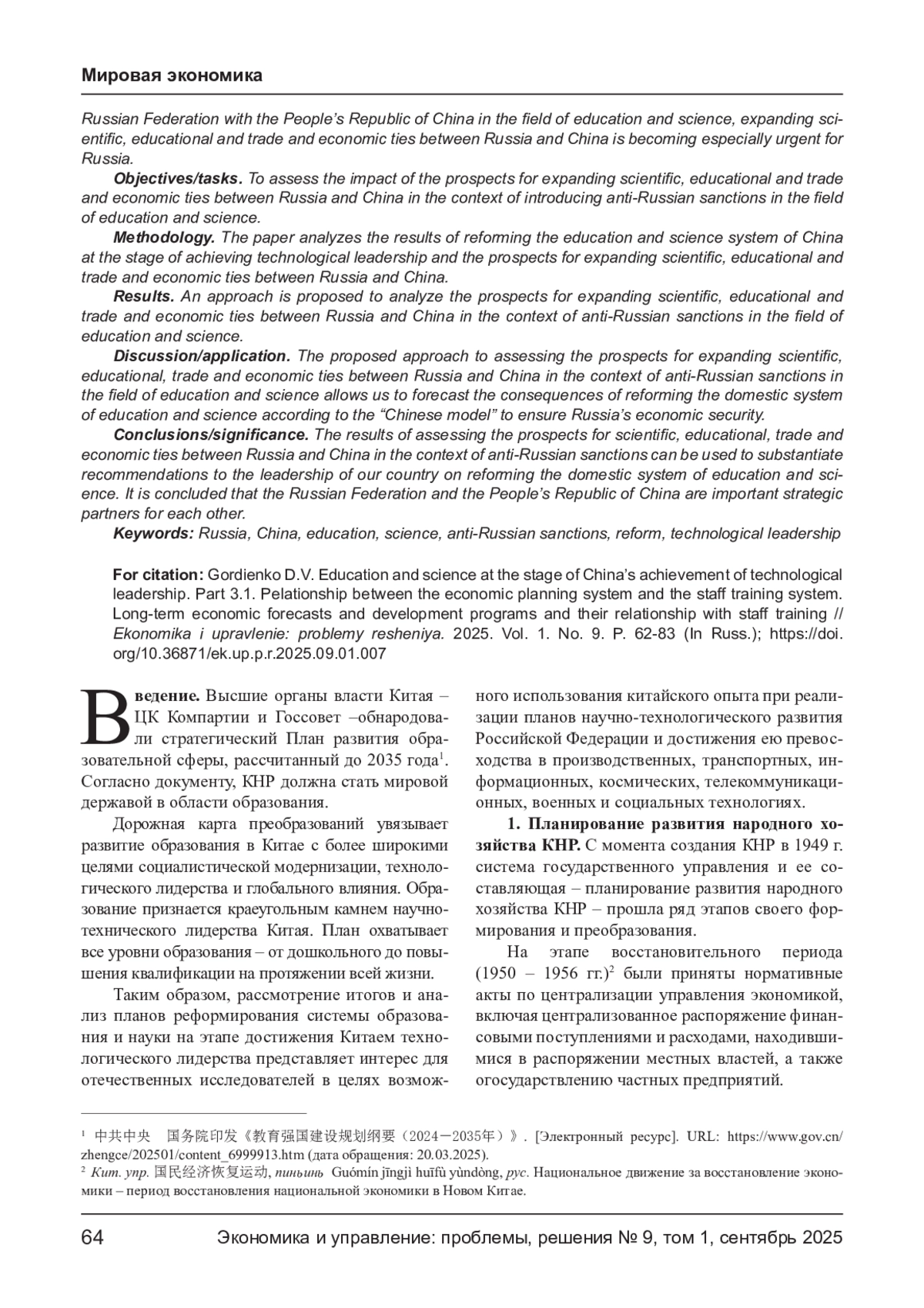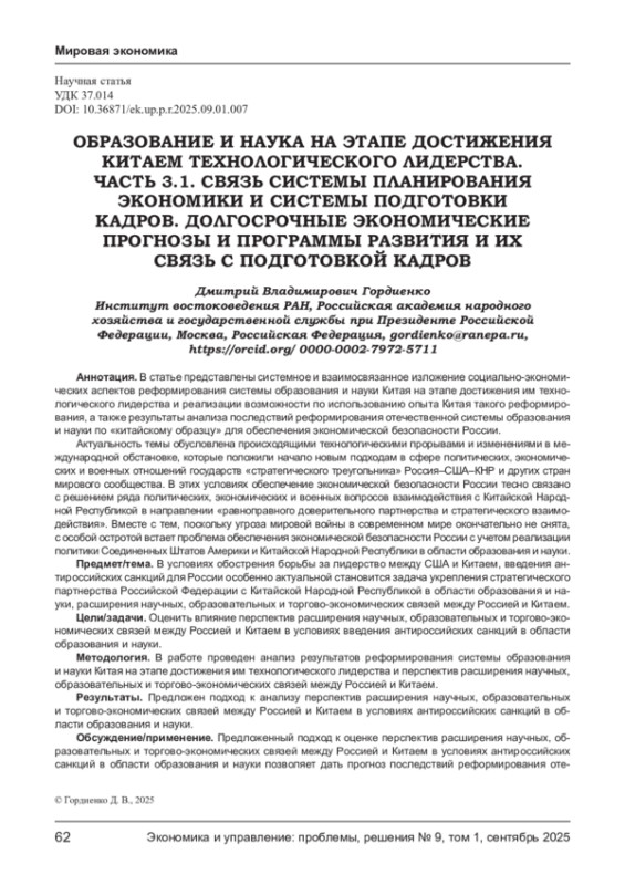 В статье представлены системное и взаимосвязанное изложение социально-экономических аспектов реформирования системы образования и науки Китая на этапе достижения им технологического лидерства и реализации возможности по использованию опыта Китая такого реформирования, а также результаты анализа последствий реформирования отечественной системы образования и науки по «китайскому образцу» для обеспечения экономической безопасности России.