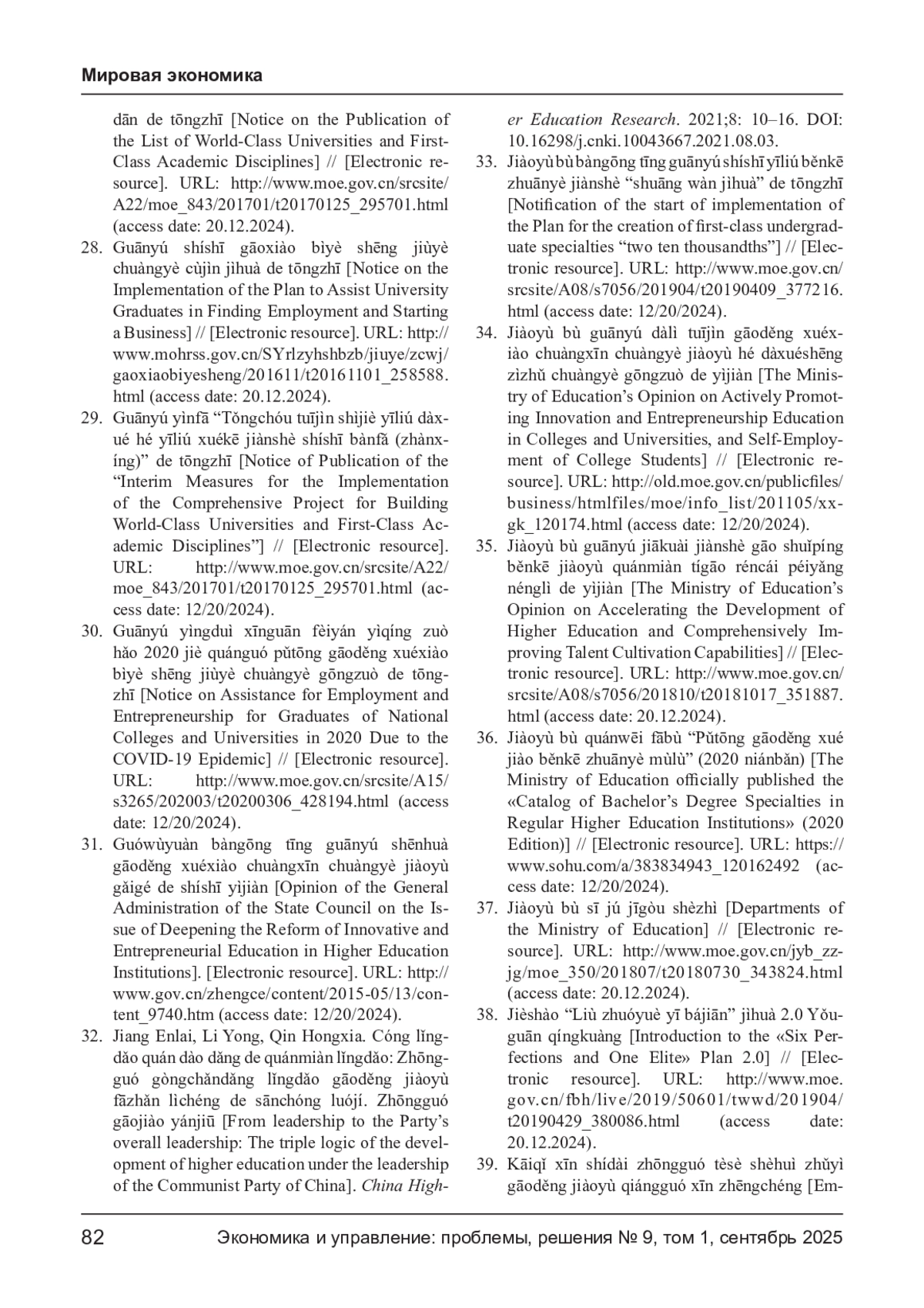 33. 教育部办公厅关于实施一流本科专业建设“ 双万计划“的通知 [Уведомление Главного управления Министерства образования о реализации “Плана двойных 10 000” по развитию первоклассных программ бакалавриата] // [Электронный ресурс]. URL: http://www.moe.gov.cn/srcsite/A08/s7056/201904/t20190409_377216.html (дата обращения: 20.12.2024).