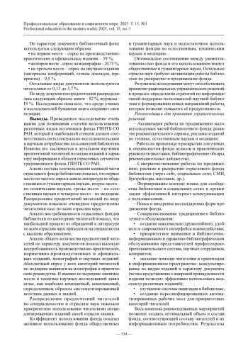 Введение. Мониторинг читательских предпочтений является необходимым условием повышения эффективности деятельности библиотеки. Актуальность исследования обусловлена постоянным процессом адаптации контента, продуктов и услуг научной библиотеки к потребностям, предпочтениям и интересам читательской аудитории.