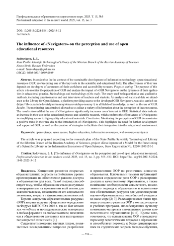 Введение. В условиях устойчивого развития информационных технологий открытые образовательные ресурсы (ООР) становятся одним из ключевых инструментов в научно-образовательной сфере. Эффективность их использования зависит от степени осознания их полезности и доступности для пользователей.