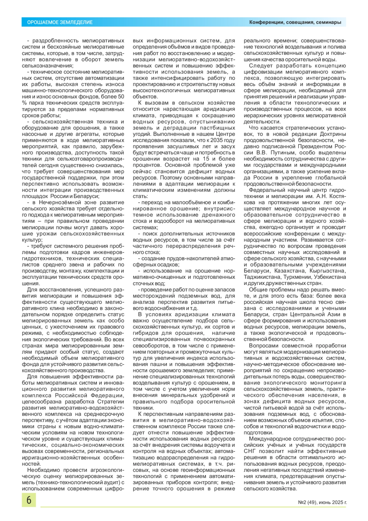 Основными негативными факторами, не позволяющими обеспечить высокую и устойчивую продуктивность мелиорированных земель, являются невысокий технический уровень и технико-эксплуатационное состояние оросительных систем, недостаточное применение комплексных агромелиоративных технологий при эксплуатации мелиорированных земель. Это приводит к нерациональному использованию водных ресурсов, развитию процессов деградации сельскохозяйственных земель, таких как эрозия, засоление, заболачивание, подтопление, потери органического вещества и элементов минерального питания, опустынивание. В связи с ростом дефицита водных ресурсов обеспечение населения и сельскохозяйственного производства качественной водой в достаточных количествах как одна из целей устойчивого развития включена в международный проект «Повестка дня в области устойчивого развития на период до 2030 года», принятый Генеральной Ассамблеей ООН 15.09.2025 г. Следовательно, направления научных исследований в области разработки и создания инновационной инженерной ирригационной инфраструктуры, адаптированной к природно-климатическим условиям агроландшафтов и эксплуатации мелиоративного природно-технологического комплекса для обеспечения рационального использования интегральных ресурсов и предотвращения развития негативных экологических процессов в мелиоративных агроландшафтах, являются важными с точки зрения общественных и государственных интересов. Материалы и методы. В качестве научно-методической базы использовались стандартные методы научных исследований: информационно-аналитические, статистические, патентные и экспериментальные, методы системного и математического анализа, экспертной оценки нормативных и научно-технических материалов, технологического и экологического мониторинга мелиоративных объектов, ретроспективный анализ научно-методических разработок в области мелиоративно-водохозяйственной и природоохранной деятельности. Результаты и обсуждение. В результате проведения мониторинговых исследований получены и представлены данные о текущем состоянии и развитии мелиоративного комплекса России к началу 2024 года. Выполнена экспертная оценка технико-экологического состояния мелиоративного комплекса и факторов, препятствующих рациональному и эколого-экономически сбалансированному использованию мелиоративной инфраструктуры, разработаны концепция и основные целевые индикаторы устойчивого развития мелиоративного комплекса России на долгосрочную перспективу – до 2040 года.