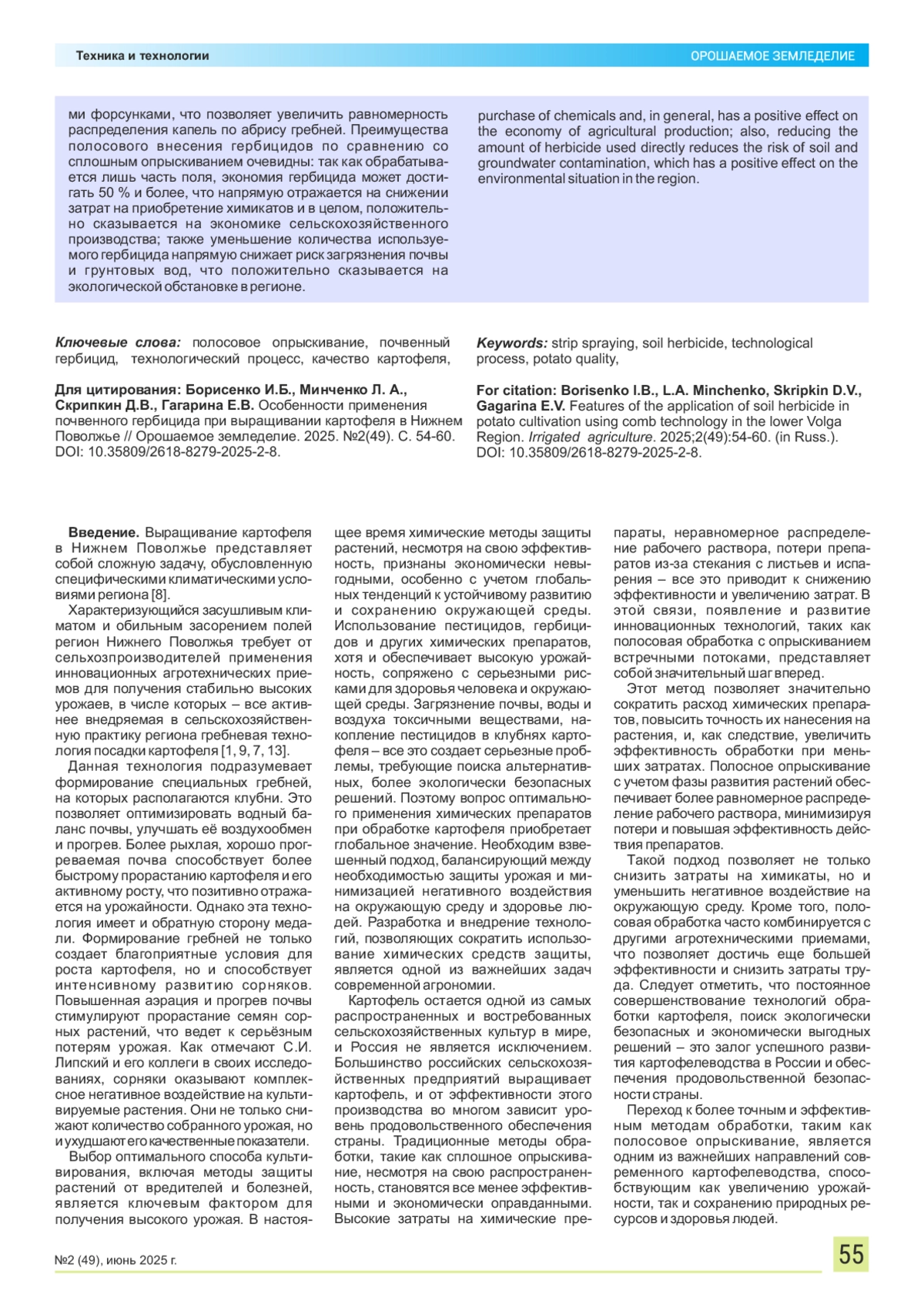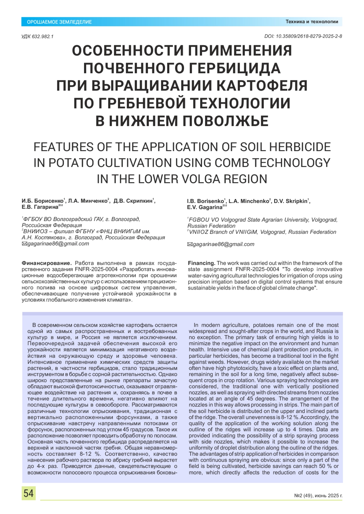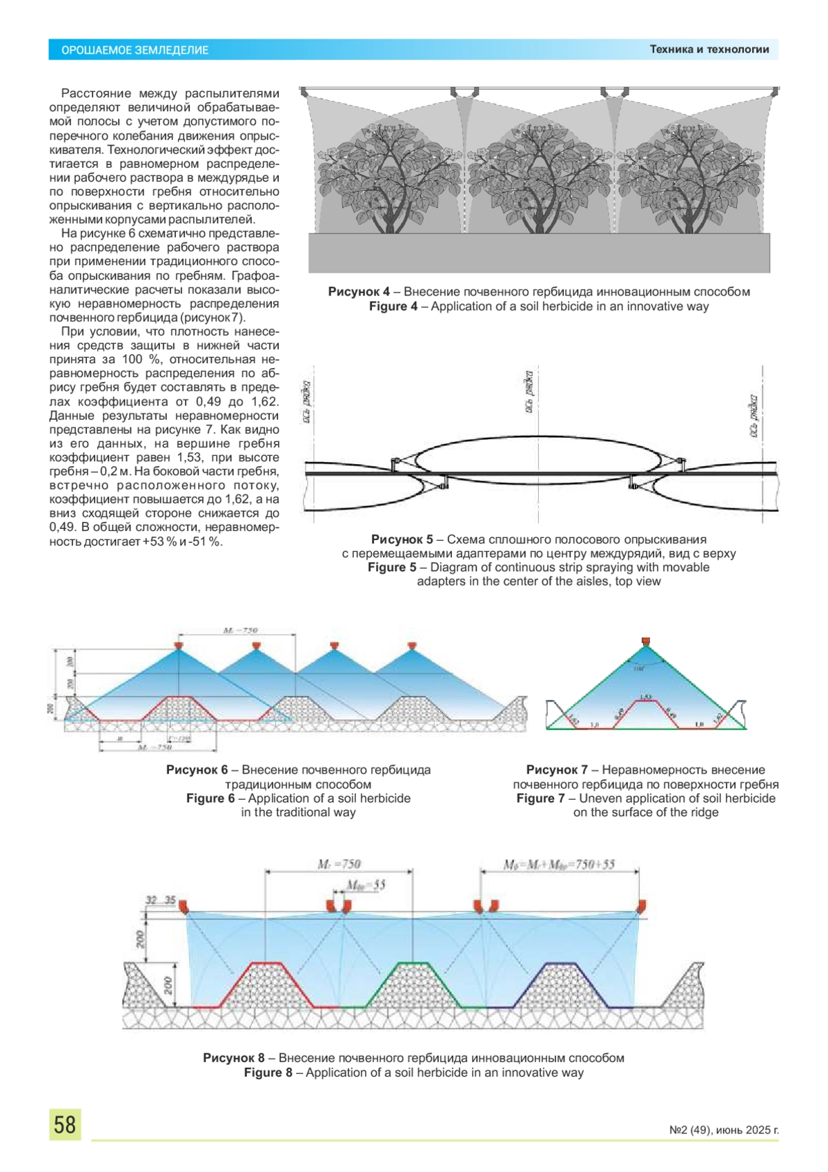 В современном сельском хозяйстве картофель остается одной из самых распространенных и востребованных культур в мире, и Россия не является исключением. Первоочередной задачей обеспечения высокой его урожайности является минимизация негативного воздействия на окружающую среду и здоровье человека. Интенсивное применение химических средств защиты растений, в частности гербицидов, стало традиционным инструментом в борьбе с сорной растительностью. Однако широко представленные на рынке препараты зачастую обладают высокой фитотоксичностью, оказывают отравляющее воздействие на растения и, сохраняясь в почве в течение длительного времени, негативно влияют на последующие культуры в севообороте. Рассматриваются различные технологии опрыскивания, традиционная с вертикально расположенными форсунками, а также опрыскивание навстречу направленными потоками от форсунок, расположенных под углом 45 градусов. Такое их расположение позволяет проводить обработку по полосам. Основная часть почвенного гербицида распределяется на верхней и наклонной частях гребня. Общая неравномерность составляет 8-12 %. Соответственно, качество нанесения рабочего раствора по абрису гребней вырастет до 4-х раз. Приводятся данные, свидетельствующие о возможности полосового процесса опрыскивания боковыми форсунками, что позволяет увеличить равномерность распределения капель по абрису гребней. Преимущества полосового внесения гербицидов по сравнению со сплошным опрыскиванием очевидны: так как обрабатывается лишь часть поля, экономия гербицида может достигать 50 % и более, что напрямую отражается на снижении затрат на приобретение химикатов и в целом, положительно сказывается на экономике сельскохозяйственного производства; также уменьшение количества используемого гербицида напрямую снижает риск загрязнения почвы и грунтовых вод, что положительно сказывается на экологической обстановке в регионе.
