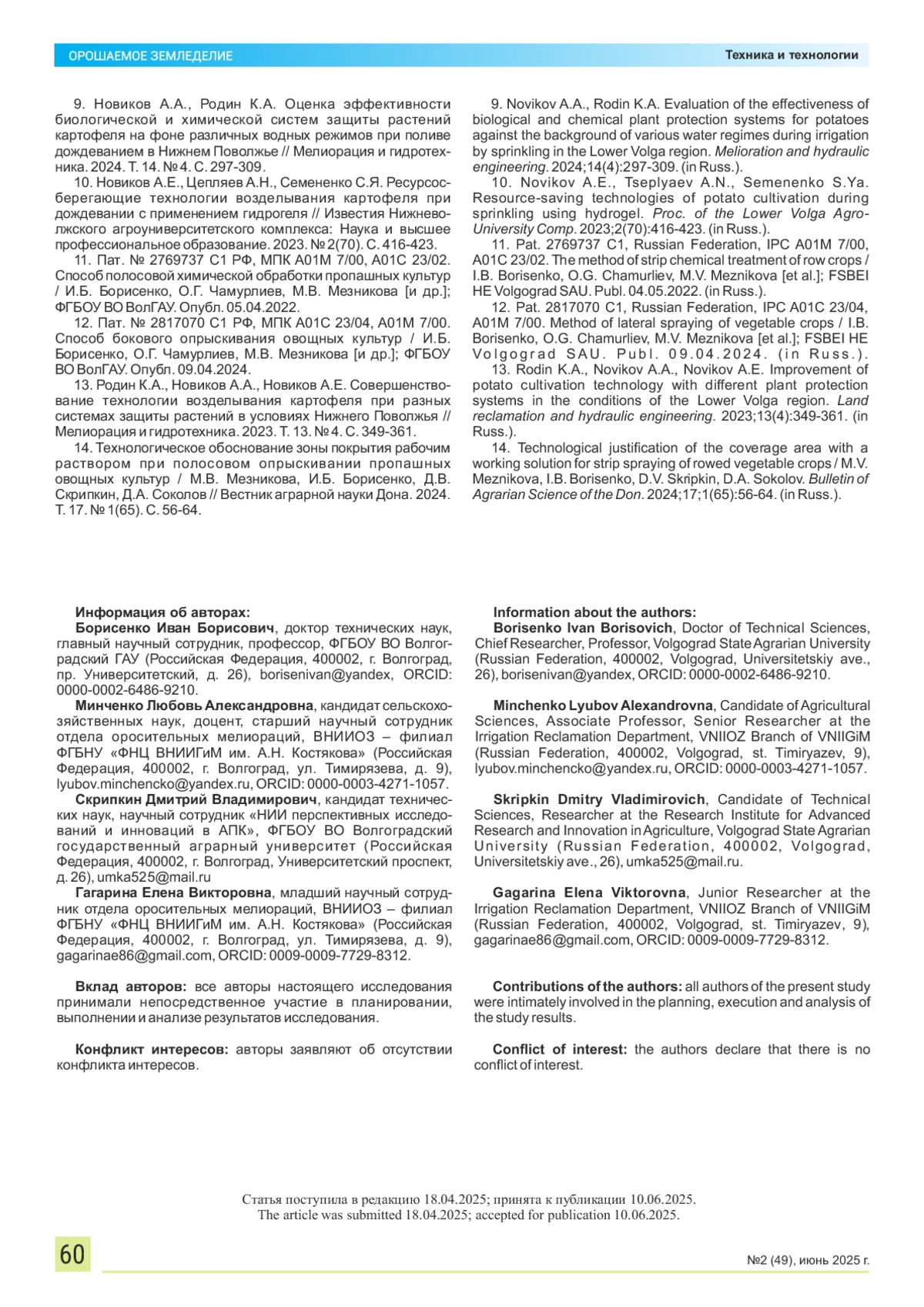 9. Новиков А.А., Родин К.А. Оценка эффективности биологической и химической систем защиты растений картофеля на фоне различных водных режимов при поливе дождеванием в Нижнем Поволжье // Мелиорация и гидротехника. 2024. Т. 14. № 4. С. 297-309.