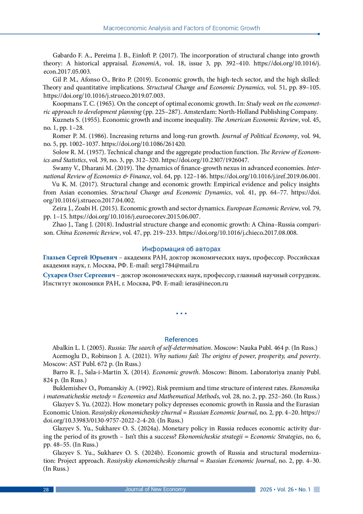 7. Глазьев С. Ю., Сухарев О. С. (2024b). Экономический рост России и структурная модернизация: проектный подход // Российский экономический журнал. № 2. С. 4-30. EDN: YETAOG