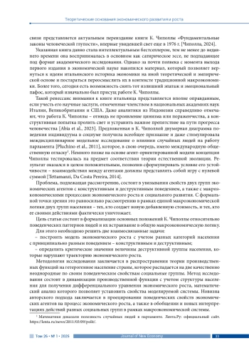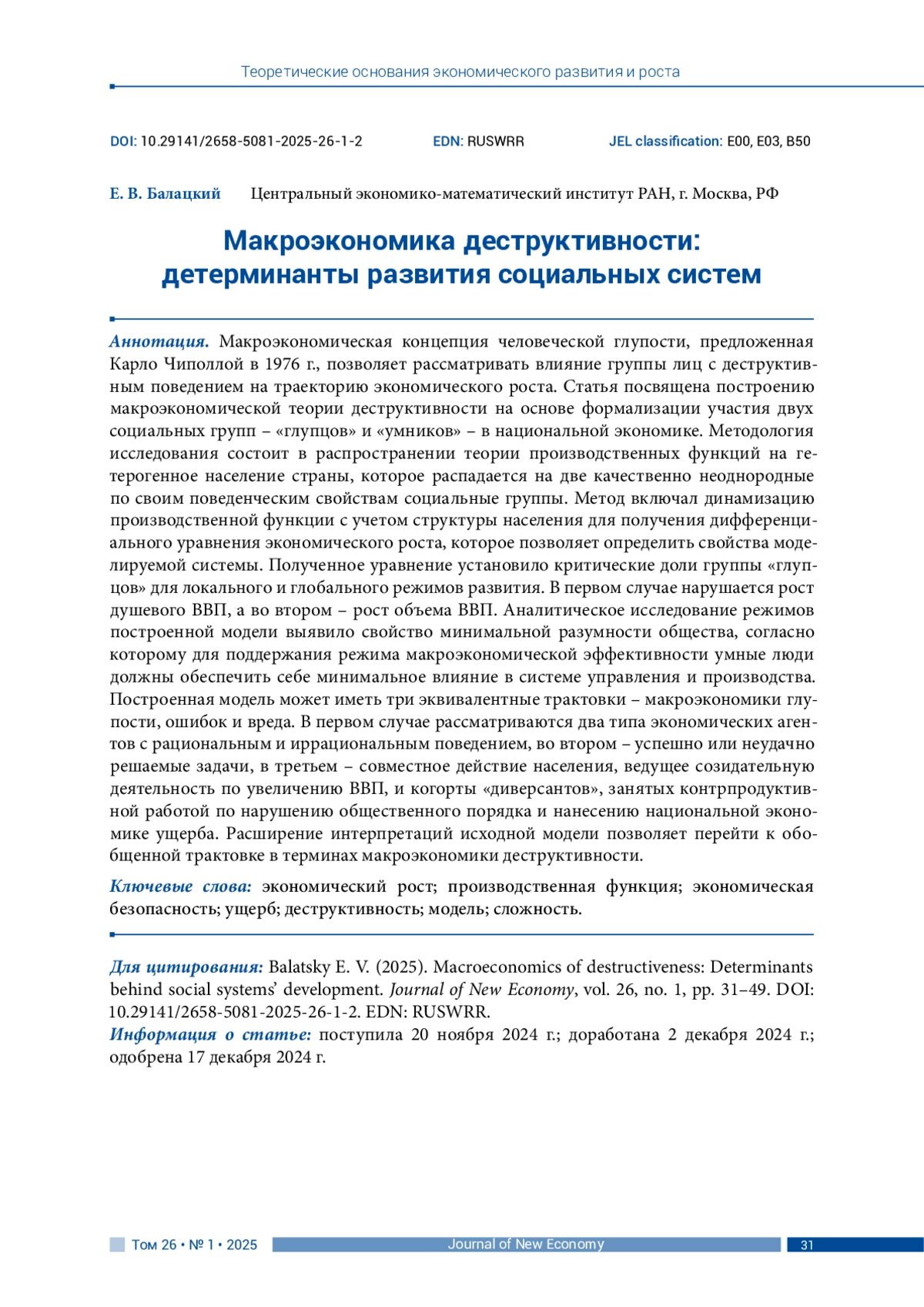 Макроэкономическая концепция человеческой глупости, предложенная Карло Чиполлой в 1976 г., позволяет рассматривать влияние группы лиц с деструктивным поведением на траекторию экономического роста. Статья посвящена построению макроэкономической теории деструктивности на основе формализации участия двух социальных групп – «глупцов» и «умников» – в национальной экономике. Методология исследования состоит в распространении теории производственных функций на гетерогенное население страны, которое распадается на две качественно неоднородные по своим поведенческим свойствам социальные группы. Метод включал динамизацию производственной функции с учетом структуры населения для получения дифференциального уравнения экономического роста, которое позволяет определить свойства моделируемой системы. Полученное уравнение установило критические доли группы «глупцов» для локального и глобального режимов развития. В первом случае нарушается рост душевого ВВП, а во втором – рост объема ВВП. Аналитическое исследование режимов построенной модели выявило свойство минимальной разумности общества, согласно которому для поддержания режима макроэкономической эффективности умные люди должны обеспечить себе минимальное влияние в системе управления и производства. Построенная модель может иметь три эквивалентные трактовки – макроэкономики глупости, ошибок и вреда. В первом случае рассматриваются два типа экономических агентов с рациональным и иррациональным поведением, во втором – успешно или неудачно решаемые задачи, в третьем – совместное действие населения, ведущее созидательную деятельность по увеличению ВВП, и когорты «диверсантов», занятых контрпродуктивной работой по нарушению общественного порядка и нанесению национальной экономике ущерба. Расширение интерпретаций исходной модели позволяет перейти к обобщенной трактовке в терминах макроэкономики деструктивности