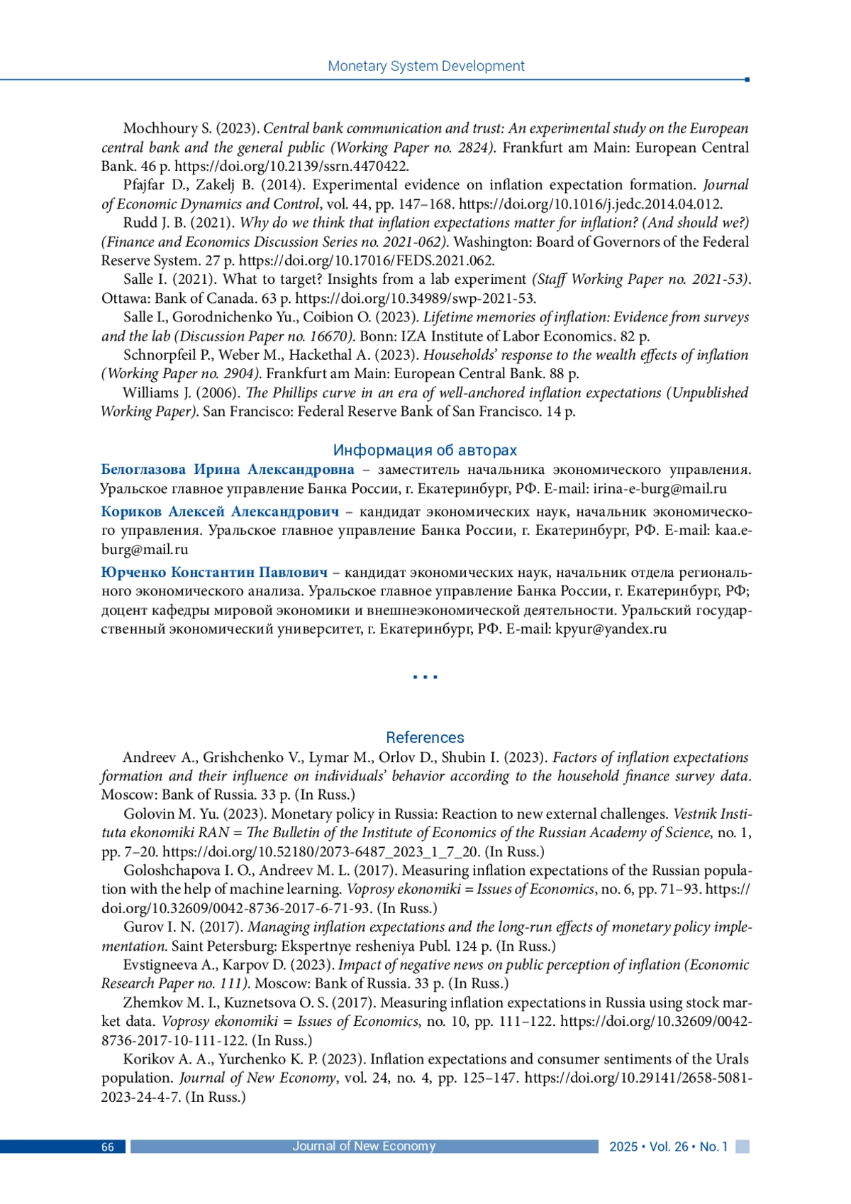 7. Кориков А. А., Юрченко К. П. (2023). Инфляционные ожидания и потребительские настроения населения Урала // Journal of New Economy. Т. 24, № 4. С. 125-147. DOI: 10.29141/2658-5081-2023-24-4-7 EDN: CFHXUM