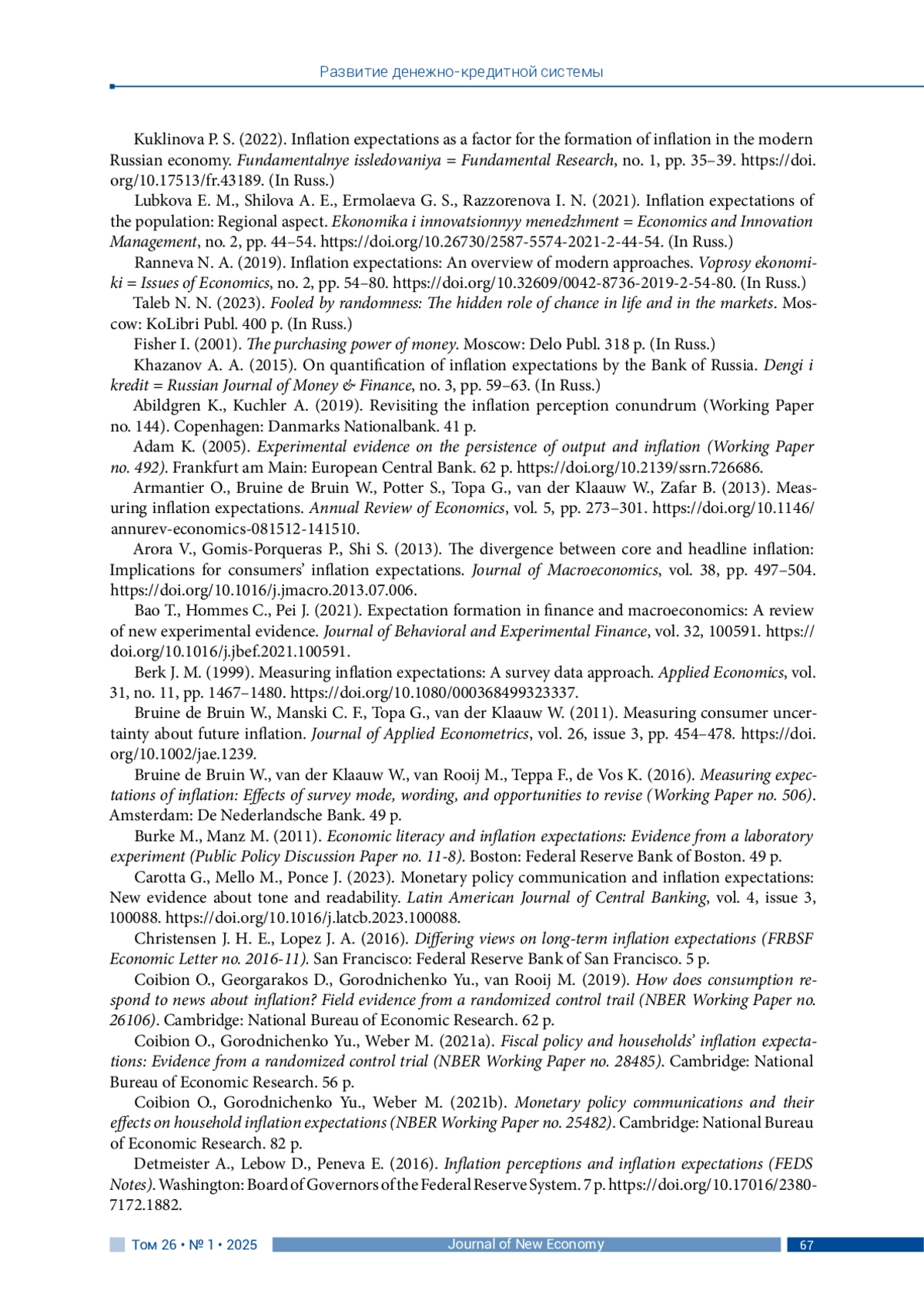 1. Андреев А., Грищенко В., Лымарь М., Орлов Д., Шубин И. (2023). Факторы формирования инфляционных ожиданий и их влияние на поведение индивидов по данным обследования финансов домохозяйств. Аналитическая записка. Москва: Центральный банк Российской Федерации. 33 с.