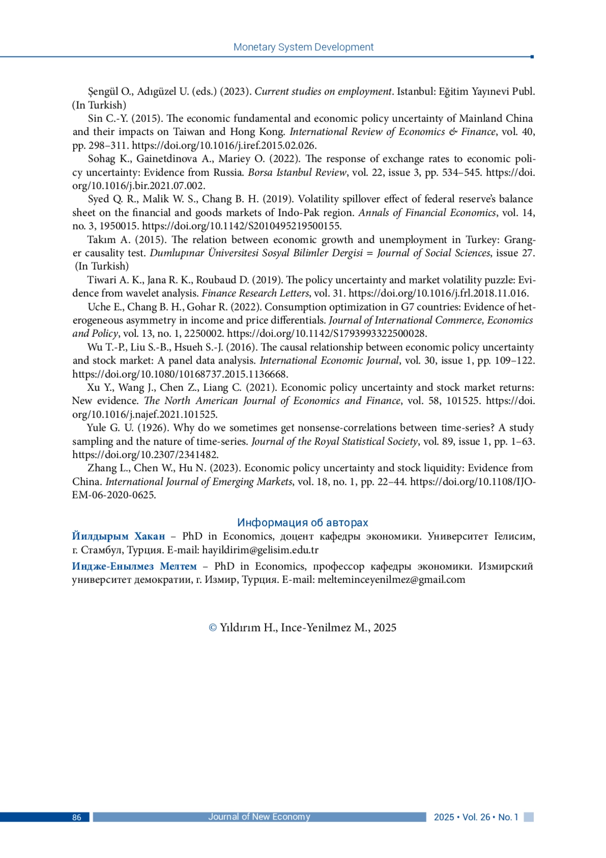 30. Ilgın K. S. (2022). Examining the relationship between national economic policy uncertainty and stock market indices: An empirical analysis for selected European countries. İktisat Politikası Araştırmaları Dergisi = Journal of Economic Policy Researches, vol. 9, issue 2, pp. 455-474. 10.26650/ JEPR1074582. (In Turkish). DOI: 10.26650/JEPR1074582