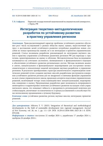 Трансдисциплинарный характер проблемы устойчивого развития обусловил рост числа исследований в разных областях науки, однако, недостаточный прогресс в достижении целей устойчивого развития потребовал разработки новых способов не только производства знаний, но и их интеграции в принятие управленческих решений. Статья посвящена разработке рекомендаций по интеграции научного знания в практику управления устойчивым развитием регионов РФ для перехода к стратегиям, ориентированным на оценку и обучение. Методологическая база исследования основывается на сочетании системного, эволюционного и функционального подходов к обеспечению устойчивого развития региональных систем. Методы включали анализ и синтез, концептуальное и функциональное моделирование для построения логикосемантических и описательных моделей интеграции научных разработок в управление регионом. В результате преобразована структура аналитического сопровождения политических решений путем создания научных миссий; разработаны инструменты измерения устойчивого развития региона для их внедрения в ключевые функции управления на всех этапах управленческого цикла; предложен алгоритм подготовки управленческих решений, включающий четыре этапа взаимодействия: концептуализацию, моделирование, измерение и оценку. Предложенные разработки дают возможность непрерывного мониторинга и корректировки политики устойчивого развития на каждом этапе управленческого цикла, что повышает гибкость и прозрачность региональной политики для стейкхолдеров, увеличивает их вовлеченность в процессы изменений и способствует более интенсивному продвижению к лучшему будущему
