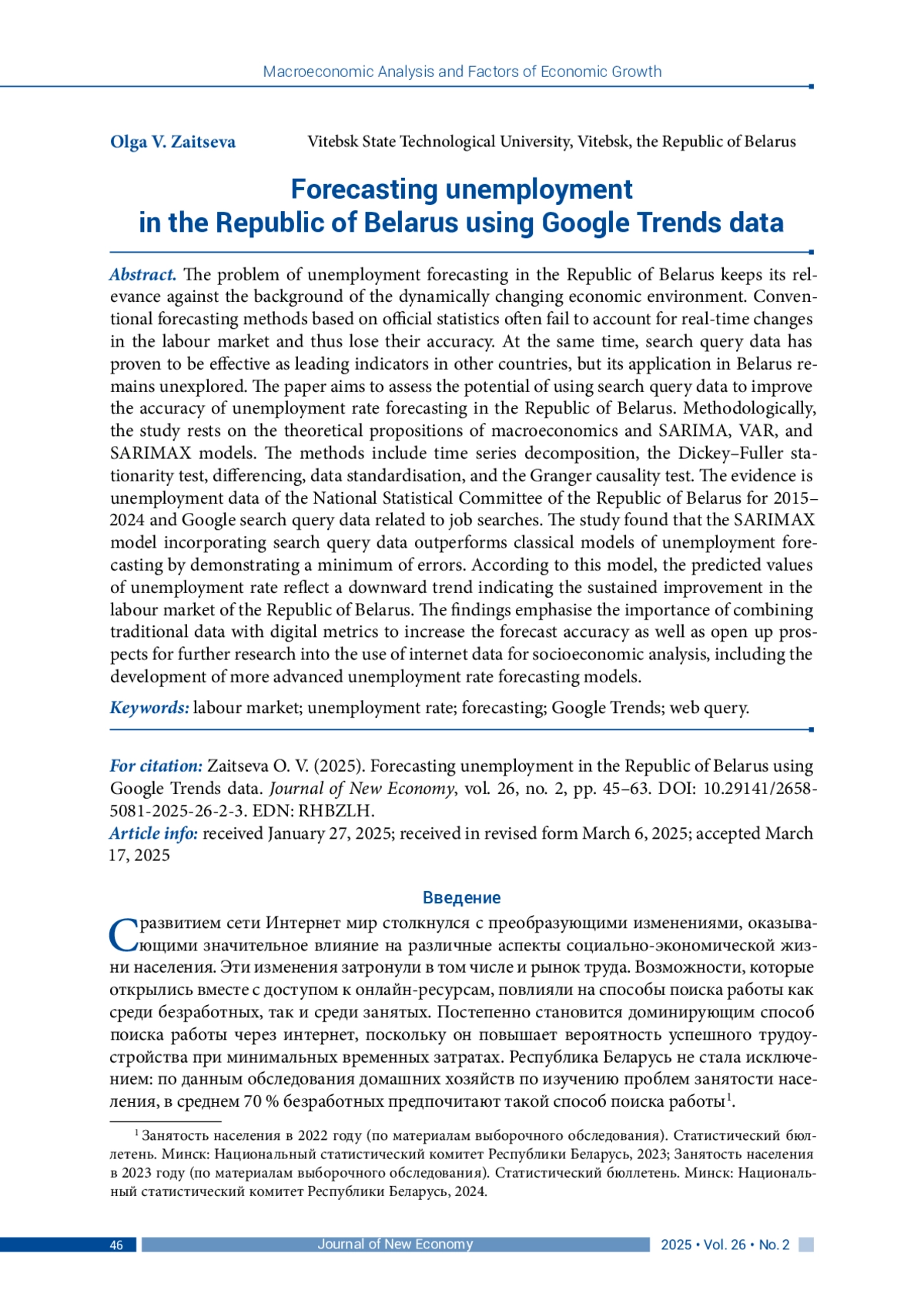 Проблема прогнозирования уровня безработицы в Республике Беларусь остается актуальной в условиях динамично изменяющейся экономической среды. Традиционные методы прогнозирования, основанные на официальной статистике, зачастую не учитывают оперативные изменения на рынке труда, что снижает их точность. В то же время данные поисковых запросов доказали свою эффективность в качестве опережающих индикаторов в других странах, однако, их применение в Беларуси остается неизученным. Статья посвящена оценке возможности использования данных поисковых запросов для повышения точности прогнозирования уровня безработицы в Республике Беларусь. Методологическую основу исследования сформировали теоретические положения макроэкономики и модели SARIMA, VAR и SARIMAX. Методы включали декомпозицию временных рядов, тест Дики – Фуллера для оценки стационарности, дифференцирование, стандартизацию данных и тест Грейнджера на причинность. Информационную базу составили данные Национального статистического комитета Республики Беларусь об уровне безработицы за 2015–2024 гг. и данные о поисковых запросах Google, связанные с поиском работы. Выявлено, что модель SARIMAX с включением данных о поисковых запросах превосходит классические модели прогнозирования безработицы, демонстрируя минимальные ошибки. Согласно этой модели, прогнозные значения уровня безработицы показали тенденцию к снижению, что отражает устойчивую динамику улучшения ситуации на рынке труда Республики Беларусь. Полученные результаты подчеркивают значимость комбинирования традиционных данных с цифровыми метриками для повышения точности прогнозов, а также открывают перспективы для дальнейших исследований в области применения интернет-данных для социально-экономического анализа, включая разработку более совершенных моделей прогнозирования безработицы