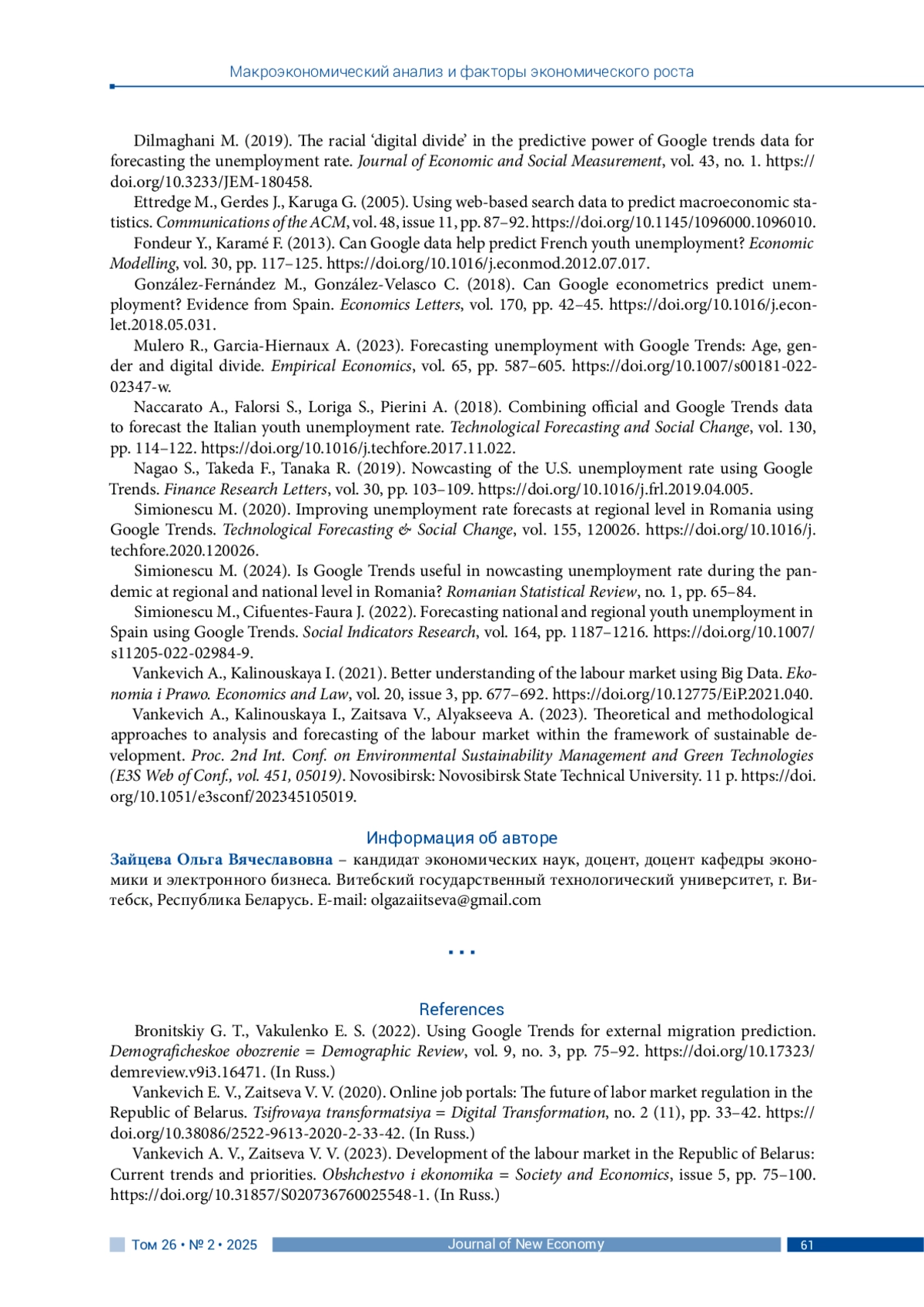 13. Borup D., Christian E., Schütte M. (2020). In search of a job: Forecasting employment growth using Google Trends. Journal of Business & Economic Statistics, vol. 40, issue 1, pp. 186-200. DOI: 10.1080/07350015.2020.1791133 EDN: FRQZZF