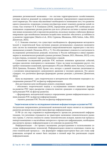 Разнородная реакция региональных экономических систем (РЭС) на фактор информатизации является слабо изученным и сложным объектом исследования в региональной экономике. Во многих работах ученые затрагивают вопросы реакций в региональной экономике, но большинство исследований носит общий характер, в них не раскрываются сущностные характеристики (свойства) реакции РЭС на фактор регионального развития