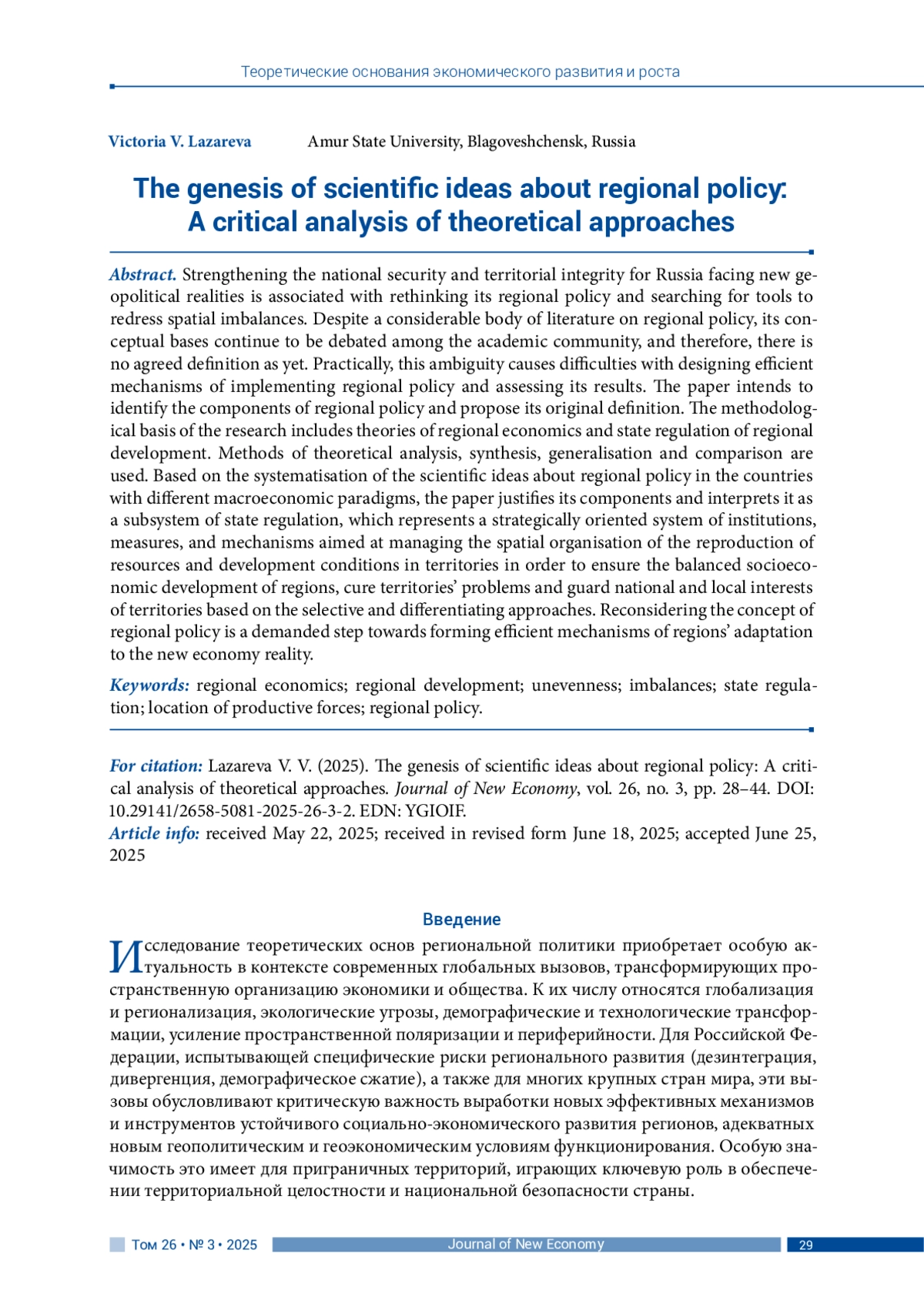 Исследование теоретических основ региональной политики приобретает особую актуальность в контексте современных глобальных вызовов, трансформирующих пространственную организацию экономики и общества. К их числу относятся глобализация и регионализация, экологические угрозы, демографические и технологические трансформации, усиление пространственной поляризации и периферийности. Для Российской Федерации, испытывающей специфические риски регионального развития (дезинтеграция, дивергенция, демографическое сжатие), а также для многих крупных стран мира, эти вызовы обусловливают критическую важность выработки новых эффективных механизмов и инструментов устойчивого социально-экономического развития регионов, адекватных новым геополитическим и геоэкономическим условиям функционирования.