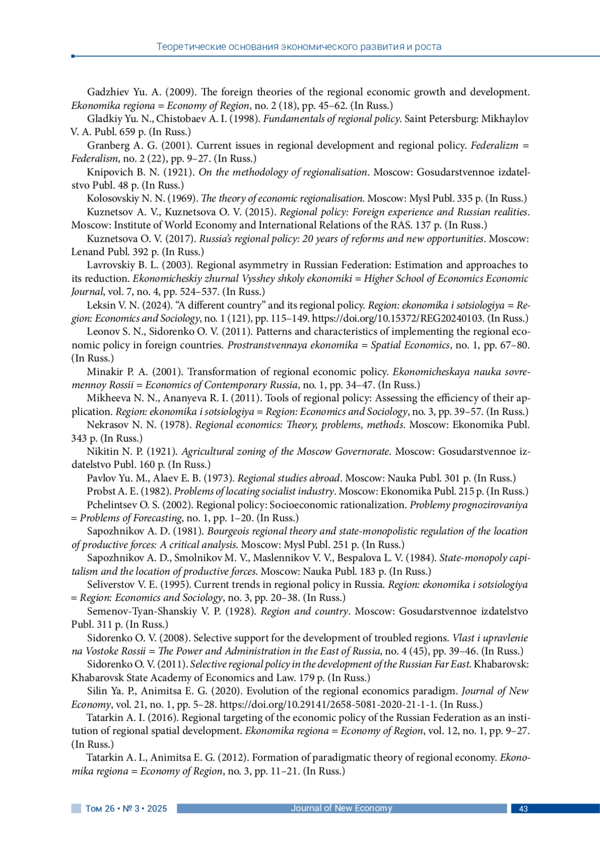 27. Силин Я. П., Анимица Е. Г. (2020). Эволюция парадигмы региональной экономики // Journal of New Economy. Т. 21, № 1. С. 5-28. DOI: 10.29141/2658-5081-2020-21-1-1 EDN: RJQVLH
