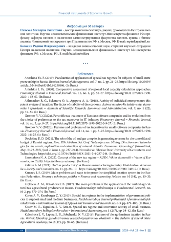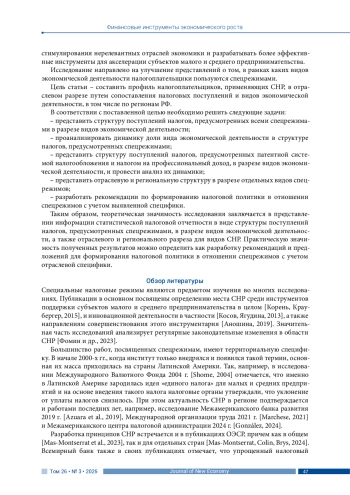 1. Аношина Ю. Ф. (2019). Особенности применения специальных налоговых режимов для субъектов малого предпринимательства в России // Russian Journal of Management. Т. 7, № 2. С. 21-25. DOI: 10.29039/article_5d4846be6331b5.96258406 EDN: NPRUNI