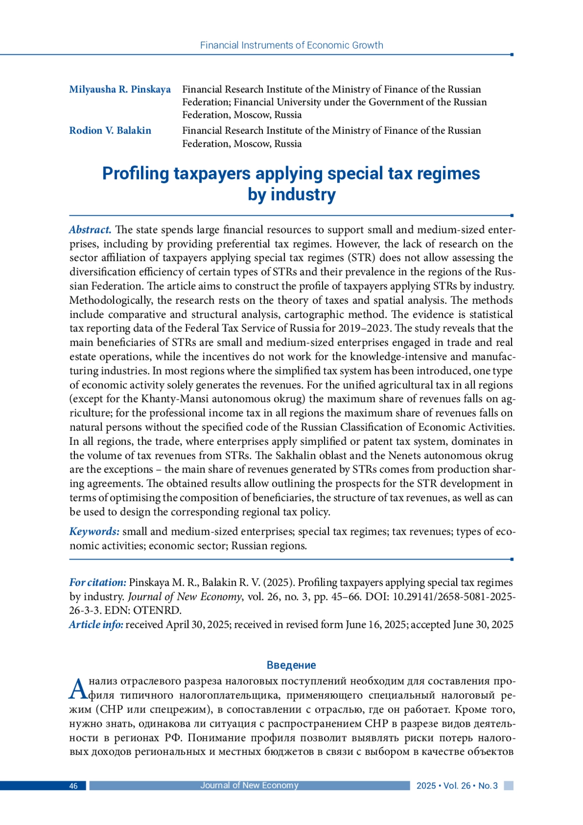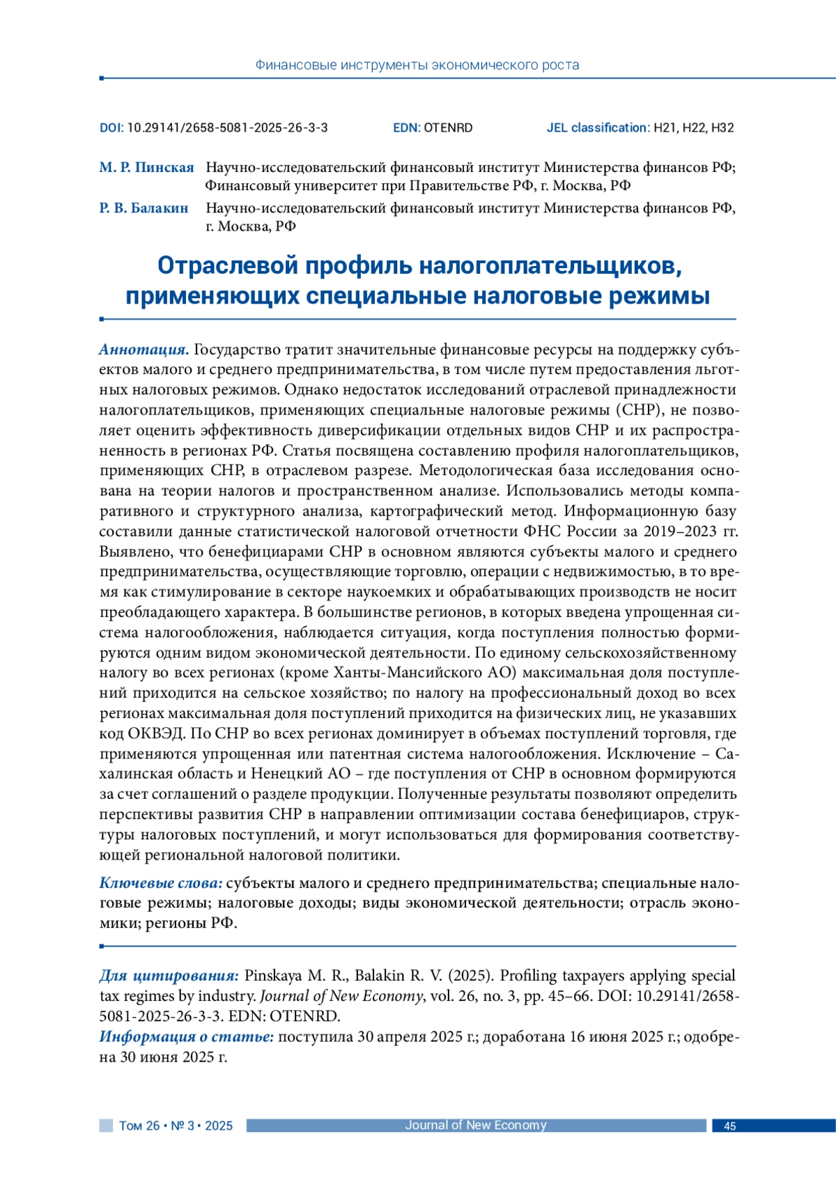 Государство тратит значительные финансовые ресурсы на поддержку субъектов малого и среднего предпринимательства, в том числе путем предоставления льготных налоговых режимов. Однако недостаток исследований отраслевой принадлежности налогоплательщиков, применяющих специальные налоговые режимы (СНР), не позволяет оценить эффективность диверсификации отдельных видов СНР и их распространенность в регионах РФ. Статья посвящена составлению профиля налогоплательщиков, применяющих СНР, в отраслевом разрезе. Методологическая база исследования основана на теории налогов и пространственном анализе. Использовались методы компаративного и структурного анализа, картографический метод. Информационную базу составили данные статистической налоговой отчетности ФНС России за 2019–2023 гг. Выявлено, что бенефициарами СНР в основном являются субъекты малого и среднего предпринимательства, осуществляющие торговлю, операции с недвижимостью, в то время как стимулирование в секторе наукоемких и обрабатывающих производств не носит преобладающего характера. В большинстве регионов, в которых введена упрощенная система налогообложения, наблюдается ситуация, когда поступления полностью формируются одним видом экономической деятельности. По единому сельскохозяйственному налогу во всех регионах (кроме Ханты-Мансийского АО) максимальная доля поступлений приходится на сельское хозяйство; по налогу на профессиональный доход во всех регионах максимальная доля поступлений приходится на физических лиц, не указавших код ОКВЭД. По СНР во всех регионах доминирует в объемах поступлений торговля, где применяются упрощенная или патентная система налогообложения. Исключение – Сахалинская область и Ненецкий АО – где поступления от СНР в основном формируются за счет соглашений о разделе продукции. Полученные результаты позволяют определить перспективы развития СНР в направлении оптимизации состава бенефициаров, структуры налоговых поступлений, и могут использоваться для формирования соответствующей региональной налоговой политики