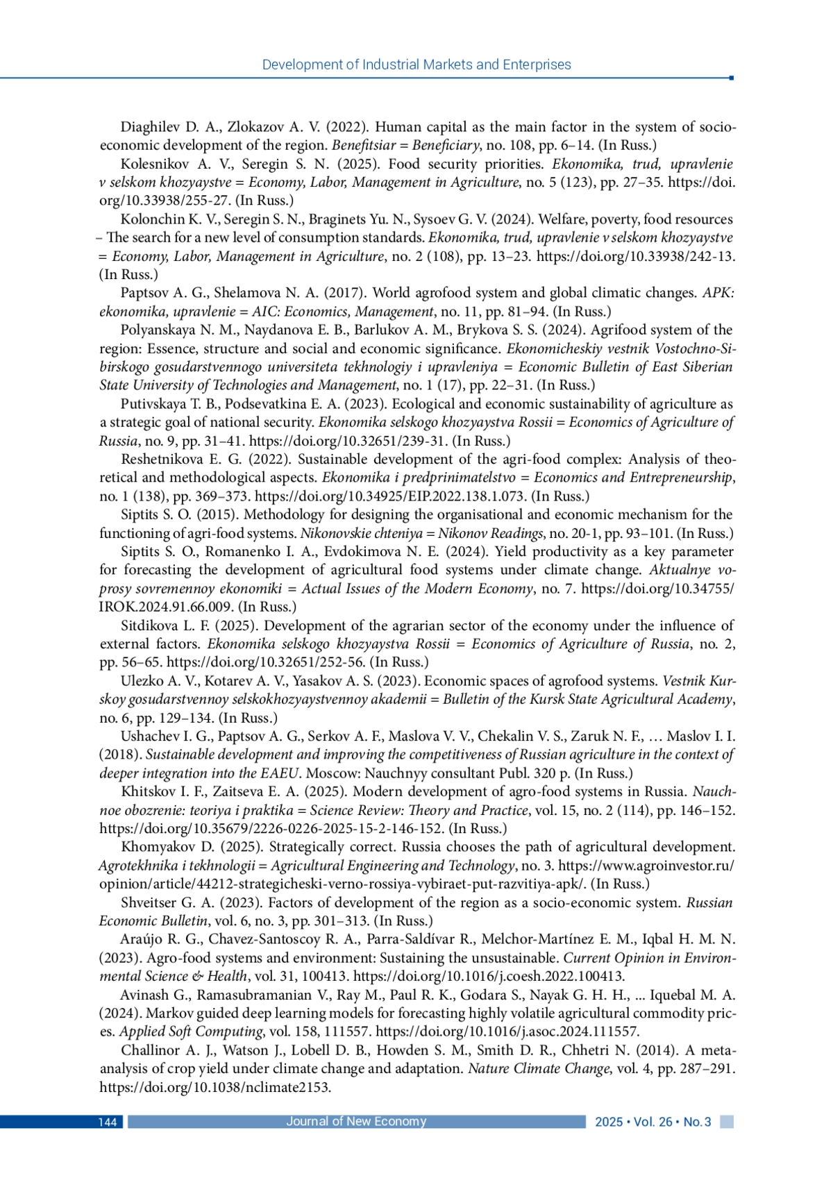 17. Хицков И. Ф., Зайцева Е. А. (2025). Современное развитие агропродовольственных систем в России // Научное обозрение: теория и практика. Т. 15, № 2 (114). С. 146-152. DOI: 10.35679/2226-0226-2025-15-2-146-152 EDN: OCPPOU